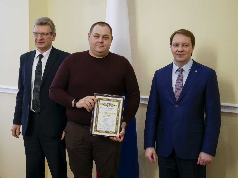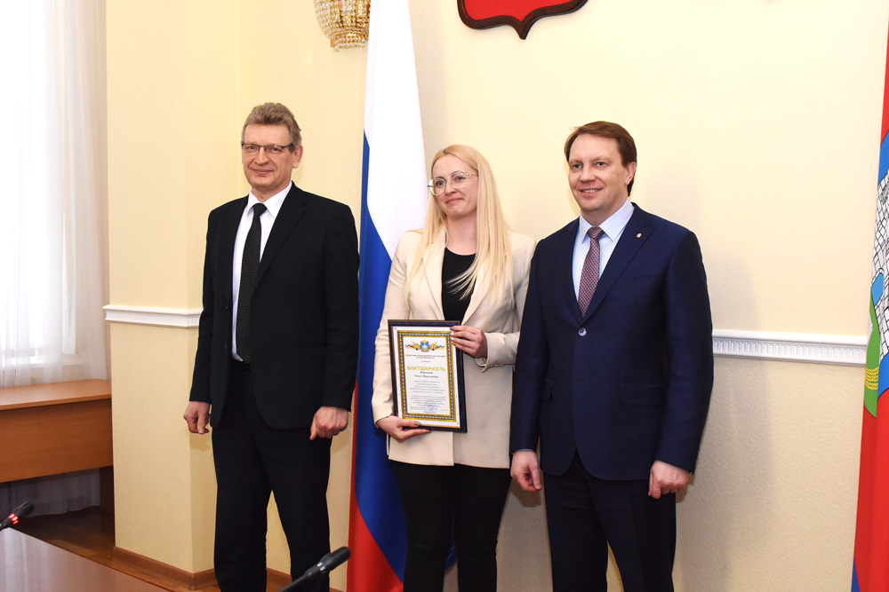 В завершении стратегической сессии Вадимом Тарасовым и Анатолием Новиковым были вручены Благодарности Департамента промышленности и торговли Орловской области участникам региональной команды за активное участие в реализации Акселератора, в том числе сотрудникам университета - Михаилу Шмаркову и Ольге Фирсовой.