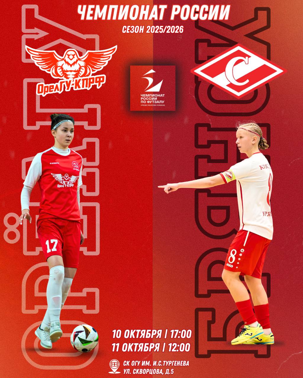 10 и 11 октября в стенах Cпортивного комплекса ОГУ имени И.С. Тургенева (ул. Скворцова, 5) состоятся матчи третьего тура Чемпионата России по футзалу среди женских команд. Соперником футболисток «ОрелГУ-КПРФ» станет дебютант главного турнира страны – брянский «Спартак».