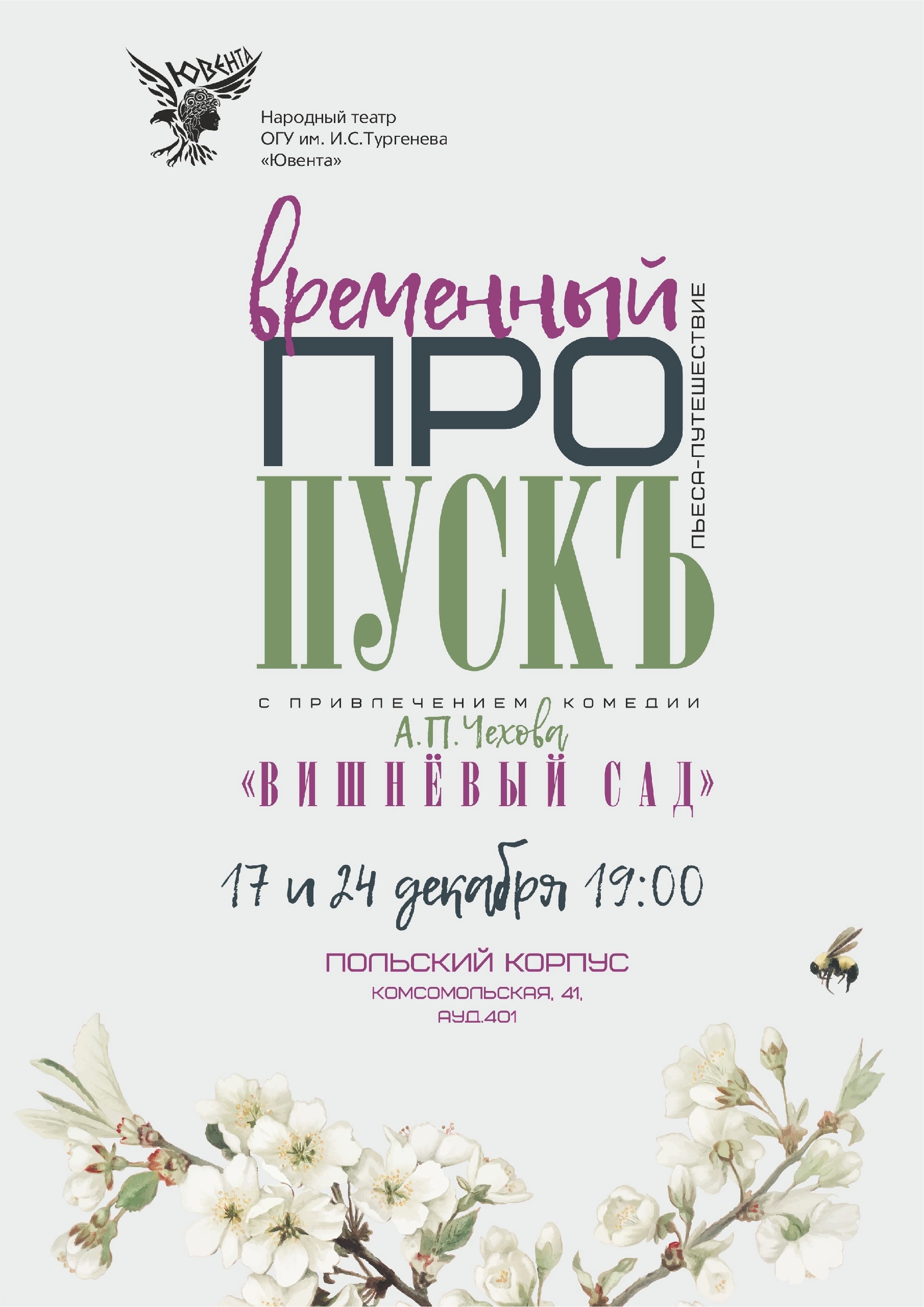 17 и 24 декабря в ОГУ имени И.С. Тургенева пройдет показ Пьесы-путешествия «Временный пропуск» по мотивам А.П.Чехова «Вишневый сад» Народного театра ОГУ имени И.С. Тургенева «Ювента».