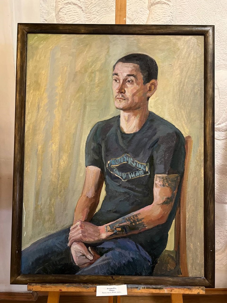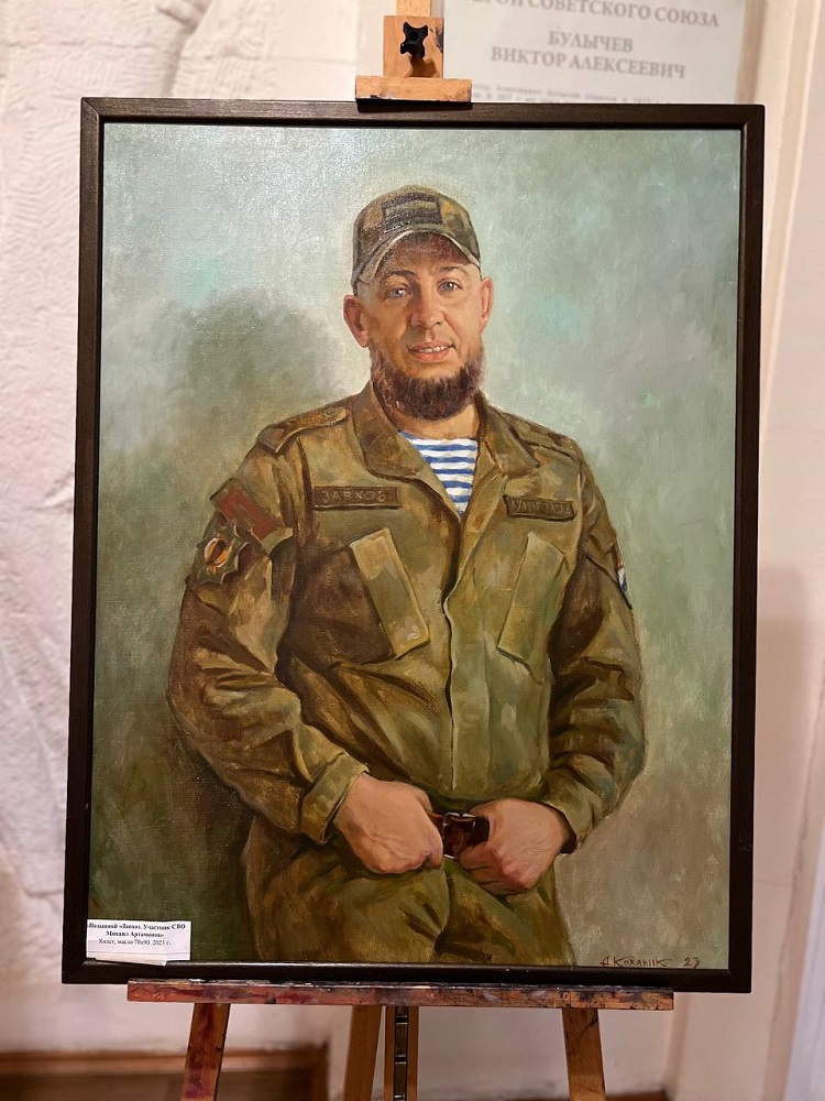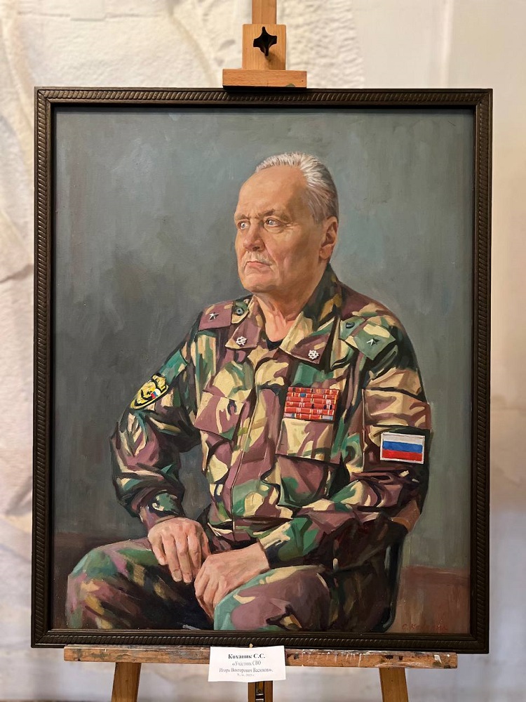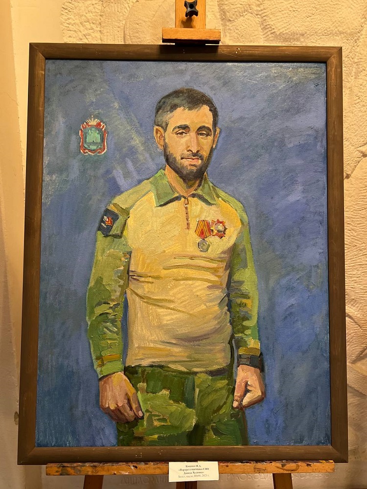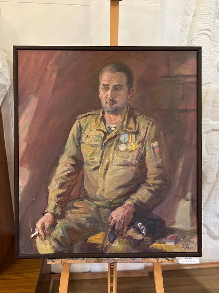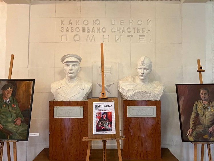 На камерной выставке «Мы вместе» представлена часть портретов героев и участников СВО: портрет Альберта Мухамеджанова, Игоря Васюкова, Дмитирия Рюмина, Рената Назарбаева, Давида Худояна, Александра Марочкина и других.