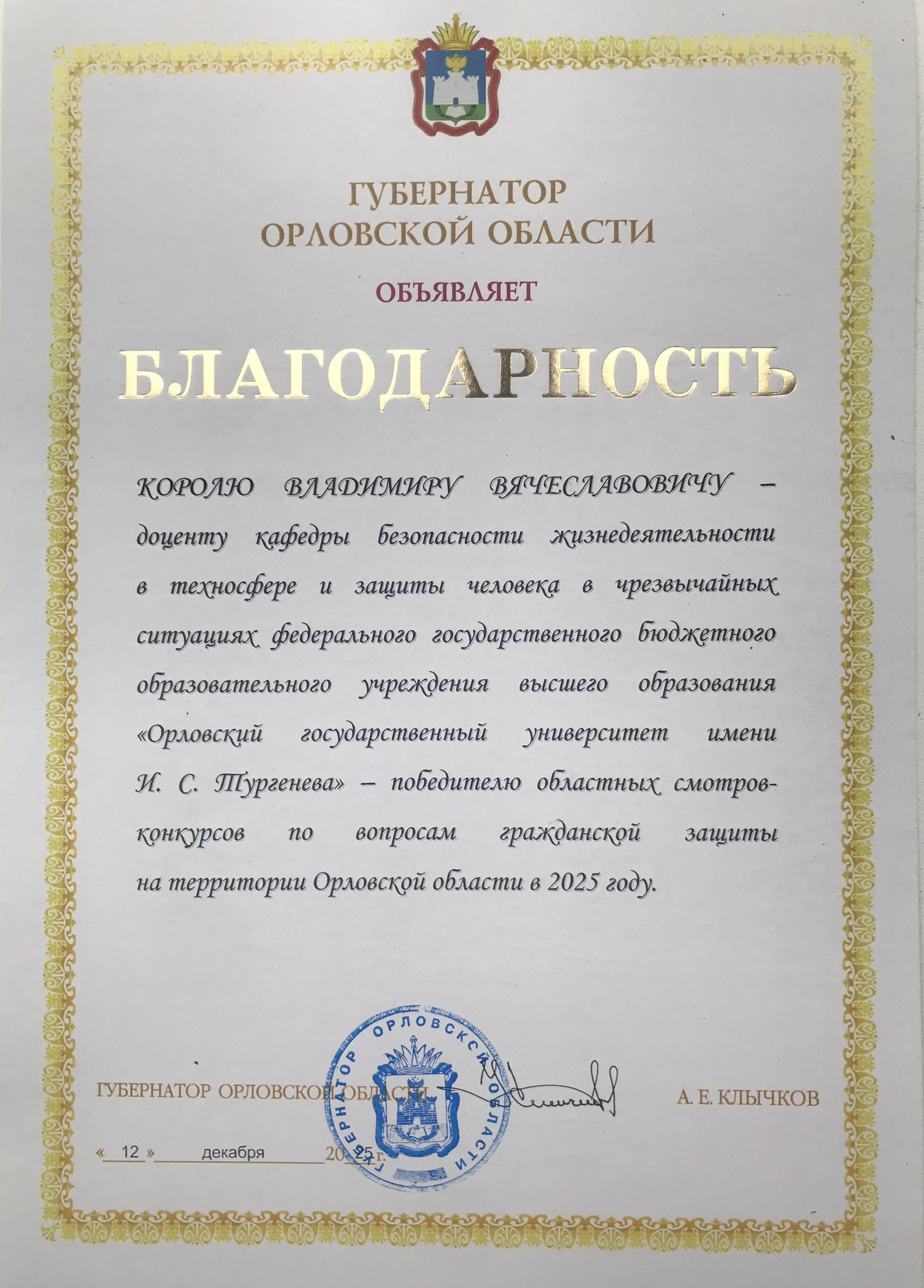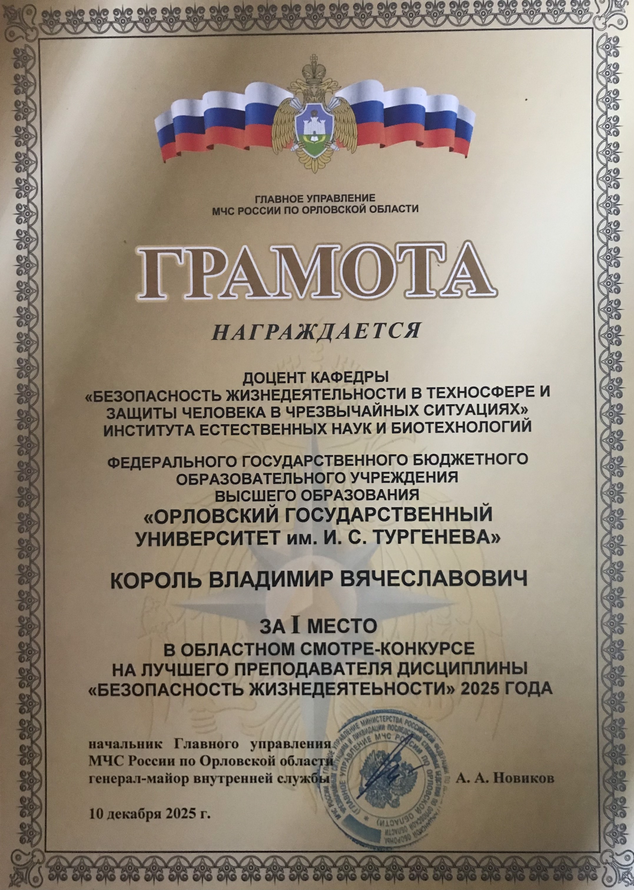 Доцент кафедры «Безопасность жизнедеятельности в техносфере и защита человека в чрезвычайных ситуациях» Института естественных наук и биотехнологий Орловского государственного университета имени И. С. Тургенева Владимир Вячеславович Король в третий раз стал победителем областного смотра-конкурса на лучшего преподавателя дисциплины «Безопасность жизнедеятельности».