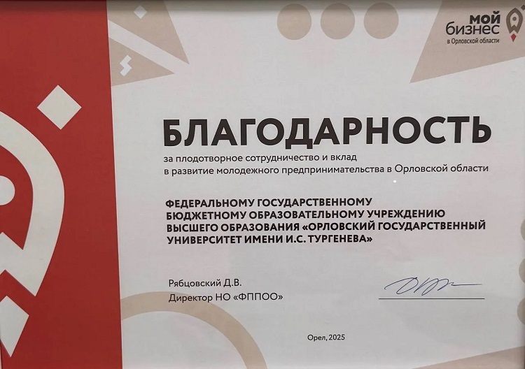 Университет выступает партером мероприятий по развитию молодежного предпринимательства в Орловской области совместно с региональными и муниципальными органами власти, Центром оказания услуг «Мой бизнес», региональным сообществом Росмолодежь.Предпринимай, Союзом «Торгово-промышленная палата Орловской области» и рядом коммерческих и некоммерческих организаций региона.