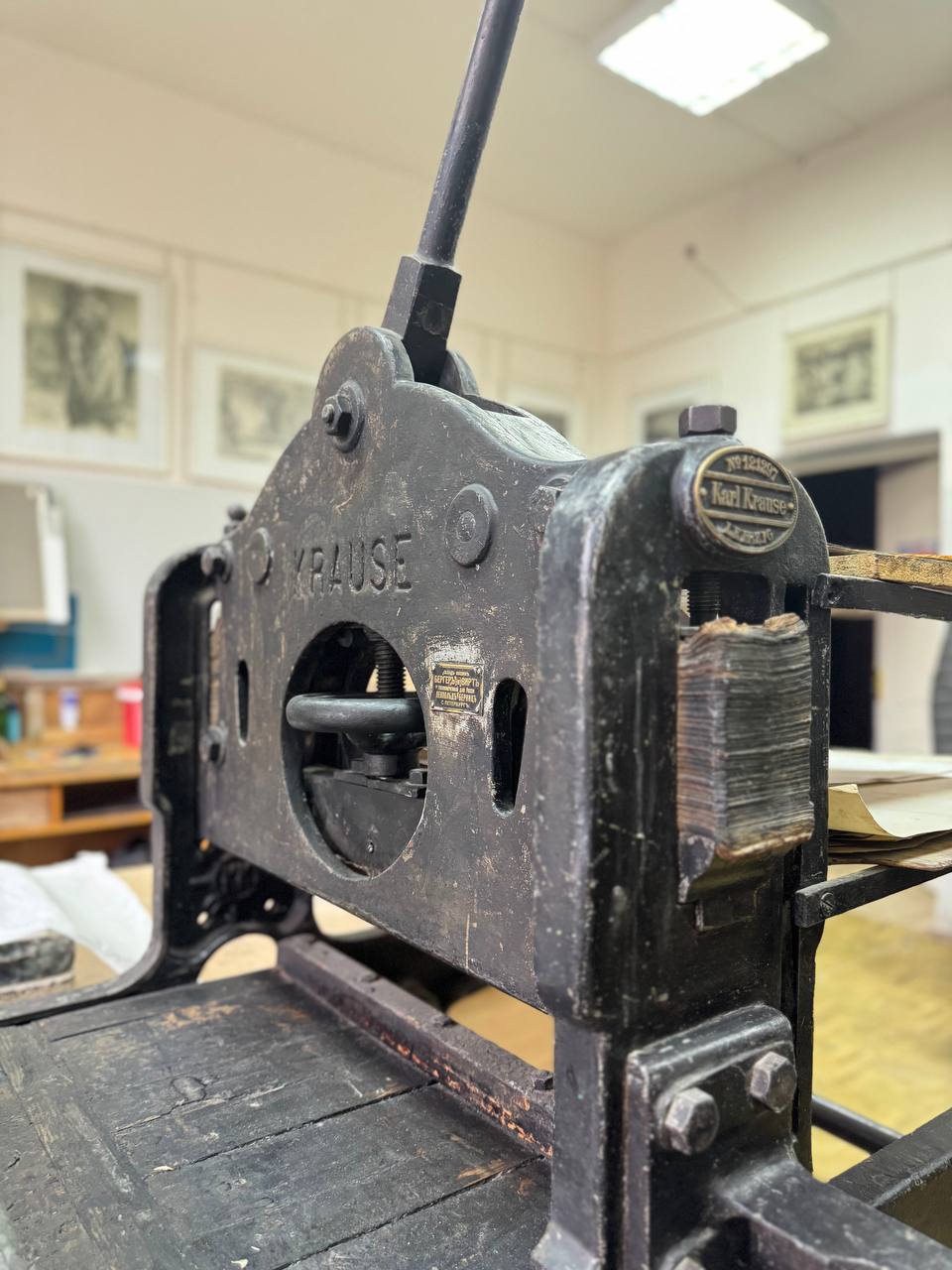 Особую историческую и технологическую ценность представляет материальная база университета. Сердцем процесса остается немецкий литографский станок фирмы Karl Krause, созданный еще в девятнадцатом веке. Это массивное оборудование — настоящий шедевр инженерной мысли прошлого. На его чугунной станине сохранилось подлинное клеймо торгового дома из Санкт-Петербурга с буквами дореволюционного алфавита. Тот факт, что станок до сих пор находится в идеальном эксплуатационном состоянии, говорит о колоссальном запасе прочности и точности механизмов, которые по сей день позволяют получать оттиски мирового уровня.