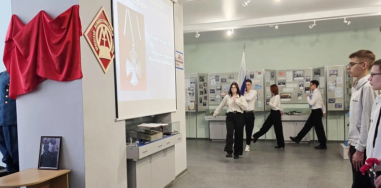 Под звуки торжественной музыки покрывало с мемориальной доски было снято. Студенты и преподаватели возложили живые цветы и почтили память воина.