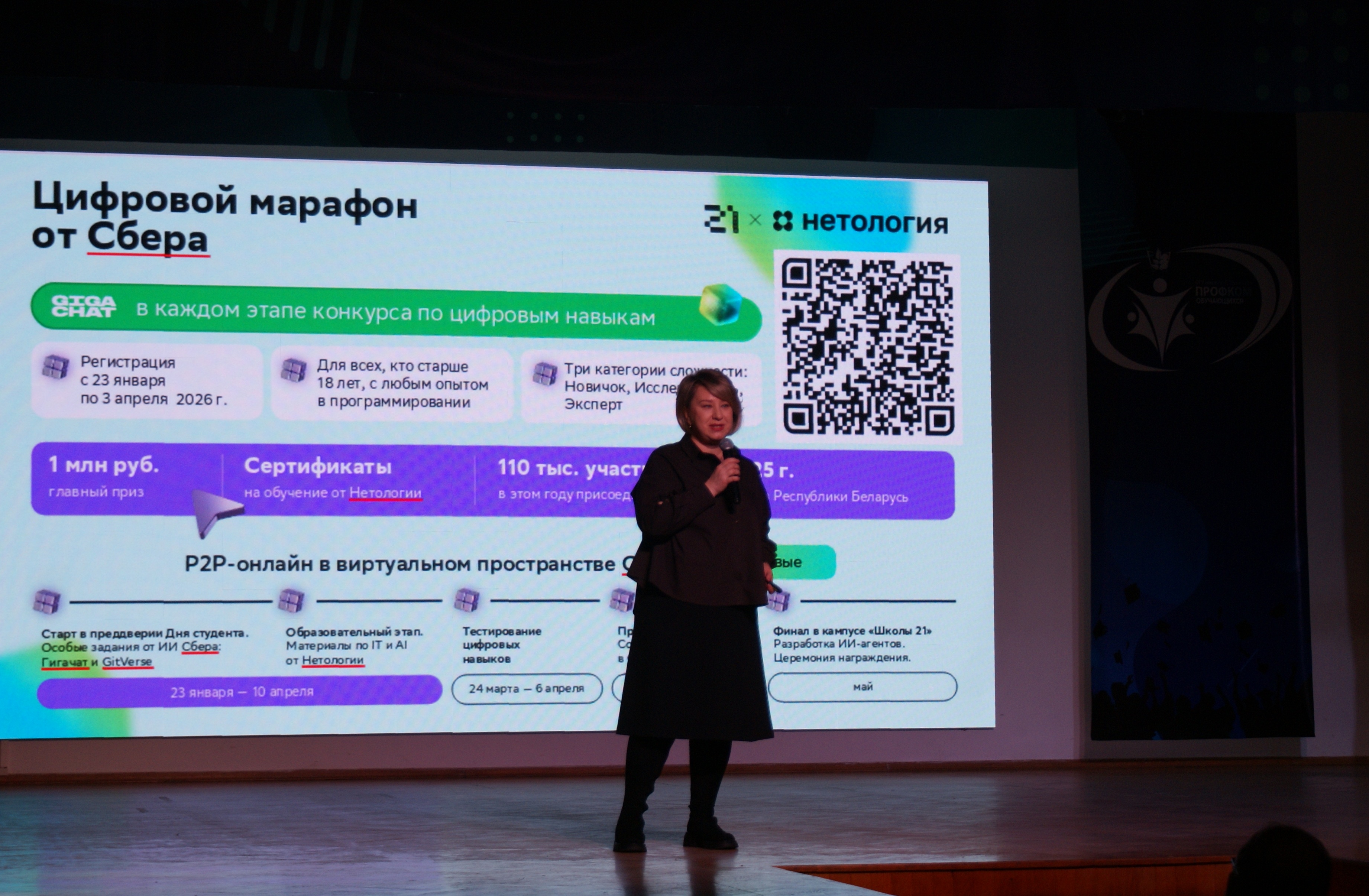 Евгения Анатольевна акцентировала внимание на значимости цифровых компетенций для современного специалиста, представив цифровой марафон Сбера как инновационный инструмент, способствующий повышению уровня цифровых навыков как у начинающих, так и у профессионалов. Этот марафон не только предоставляет участникам возможность развития своих цифровых компетенций, но и предлагает систему мотивации через систему подарков и призов, что способствует повышению их вовлеченности и эффективности обучения.