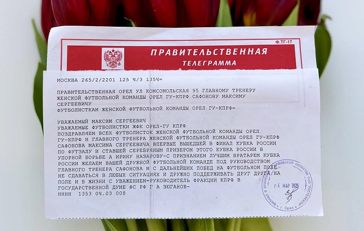 "Поздравляем всех футболисток женской футбольной команды Орел ГУ-КПРФ и главного тренера команды Сафонова Максима Сергеевича, впервые вышедшей в финал Кубка России по футзалу и ставшей серебрянным призером этого кубка России в упорной борьбе, а Ирину Назарову - с признанием лучшим вратарем Кубка России.