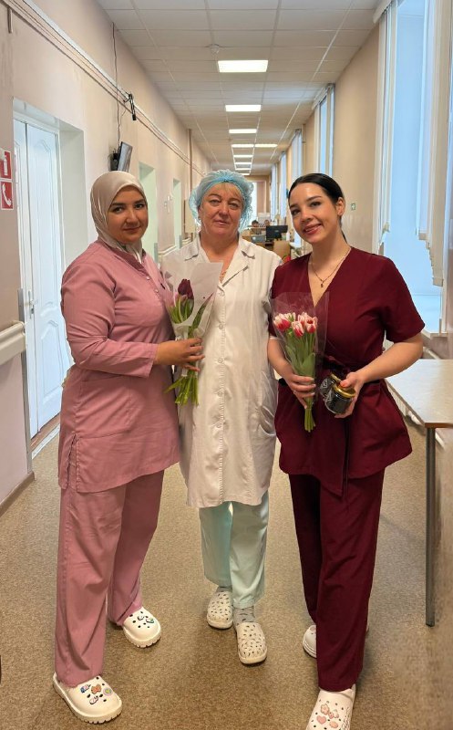 Так, студенты посетили отделение нефрологии и диализа Орловской областной клинической больницы, где поздравили сотрудников Дарью Кречетову и Дженнет Арсланову. В эндокринологическом отделении волонтеры также вручили цветы медицинским работникам и пациенткам.
