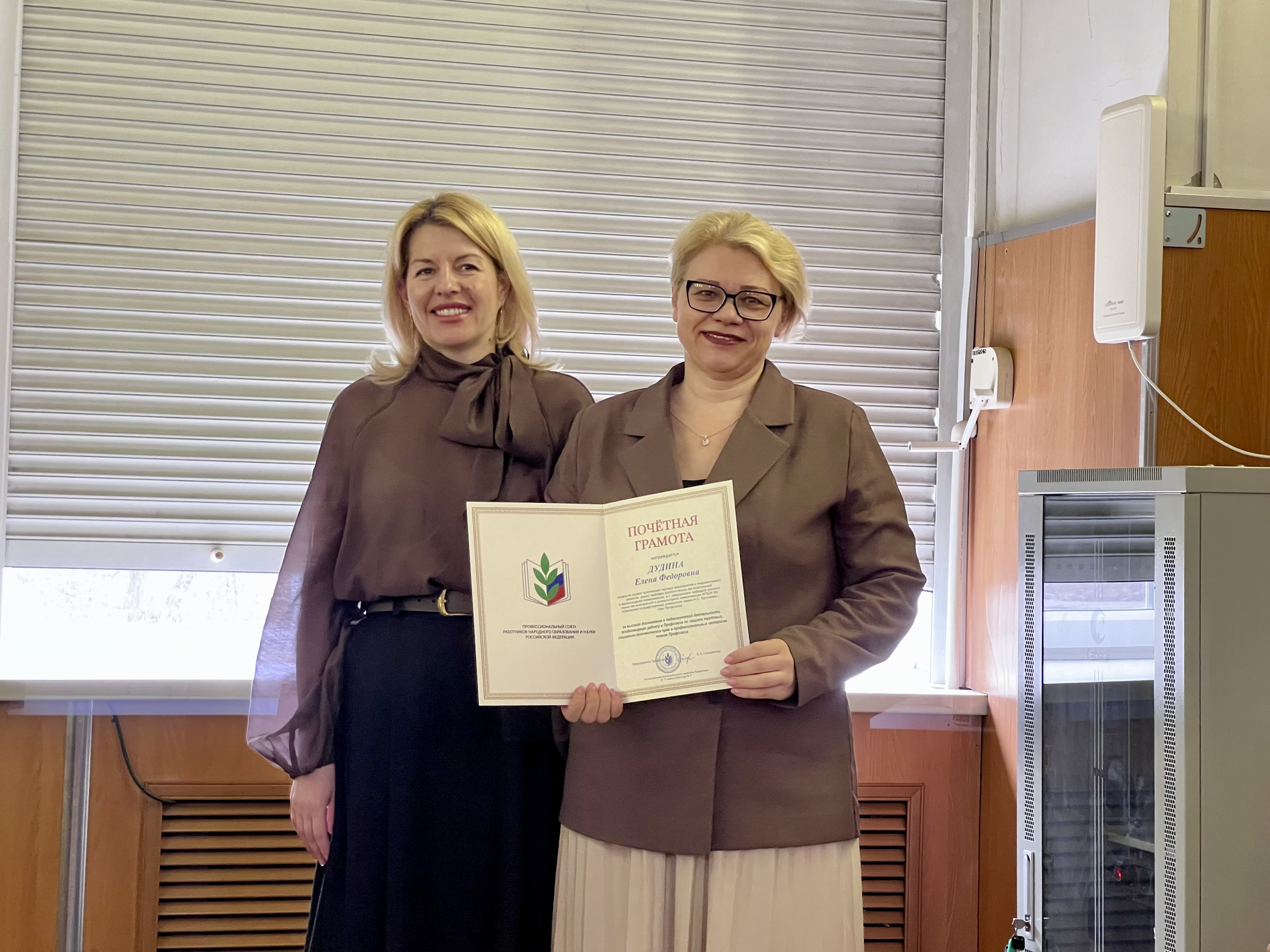 За высокие достижения в педагогической деятельности и плодотворную работу в Профсоюзе Профессиональный союз работников образования и науки РФ Почетной грамотой награждена Елена Дудина, координатор проведения научных мероприятий.