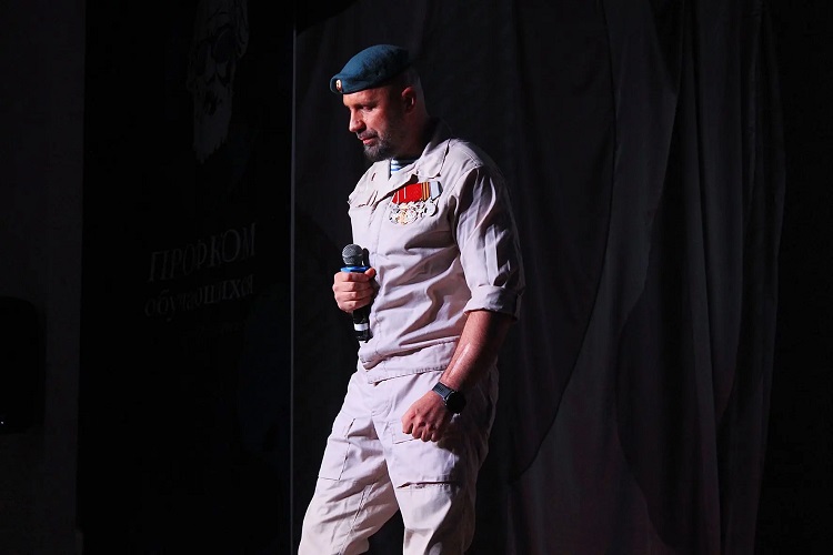 В большом зале, перед аудиторией, состоявшей из курсантов Военного учебного центра и студентов университета, выступил ветеран спецназа Воздушно-десантных войск Вячеслав Корнеев.