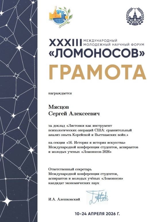 20 апреля в Московском государственном университете имени М.В. Ломоносова состоялся XXXIII Международный молодёжный научный форум «Ломоносов». Студент Сергей Мясцов выступил с докладом на секции исторического факультета МГУ, проведя сравнительный анализ листовок времён Корейской и Вьетнамской войн. «Работа секции прошла в атмосфере конструктивной дискуссии и взаимного интереса. Это бесценный опыт представления своей работы на таком высоком уровне», — отметил Сергей.