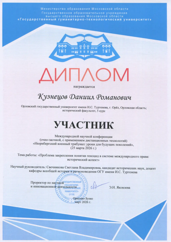 25 марта в городе Орехово-Зуево Московской области прошла международная конференция «Нюрнбергский военный трибунал: уроки для будущих поколений». Студенты Даниил Кузнецов и Валентина Захарова представили совместный доклад, посвященный сложным вопросам установления фактов геноцида народов СССР и методологии изучения этих тем в школьных курсах истории. Работа была высоко оценена экспертами и отмечена дипломом. «Нюрнберг доказал: зло должно быть названо и наказано. Эта конференция позволила увидеть полную картину трибунала и его непреходящее значение», — поделилась впечатлениями Валентина.
