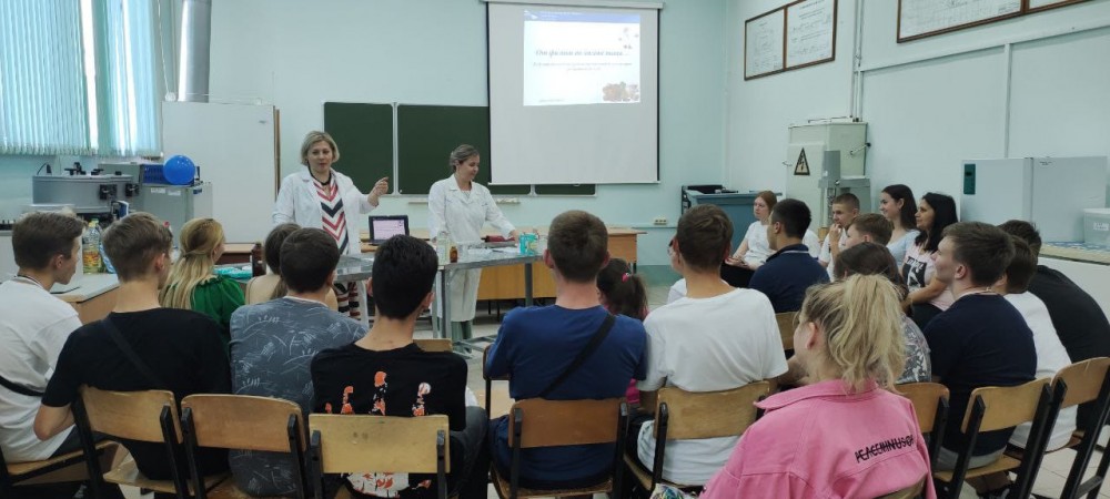 Зав. кафедрой Симоненкова А.П. и доцент Демина Е.Н. показали для участников мастер-класс «От физики до химии пищи». На нем ребята смогли окунуться в мир физики и химии, непосредственно приняв участие в разных экспериментах, объясняющих те или иных физико-химические процессы. Например, на опыте под названием «Исчезновение конфет» ребята узнали о диффузии веществ в разных средах, а эксперимент с краснокочанной капустой позволил определить кислотность различных пищевых продуктов. К концу мастер-класса науками заинтересовались даже те, кто изначально признался в неприязни к ним.