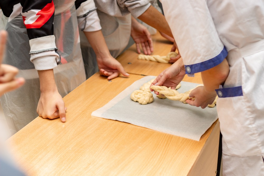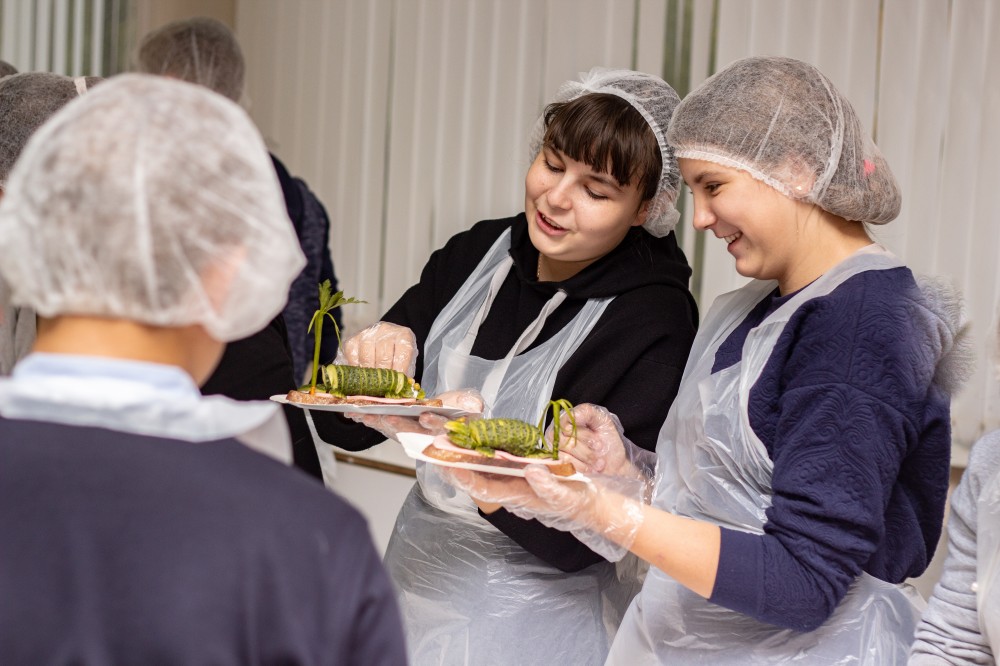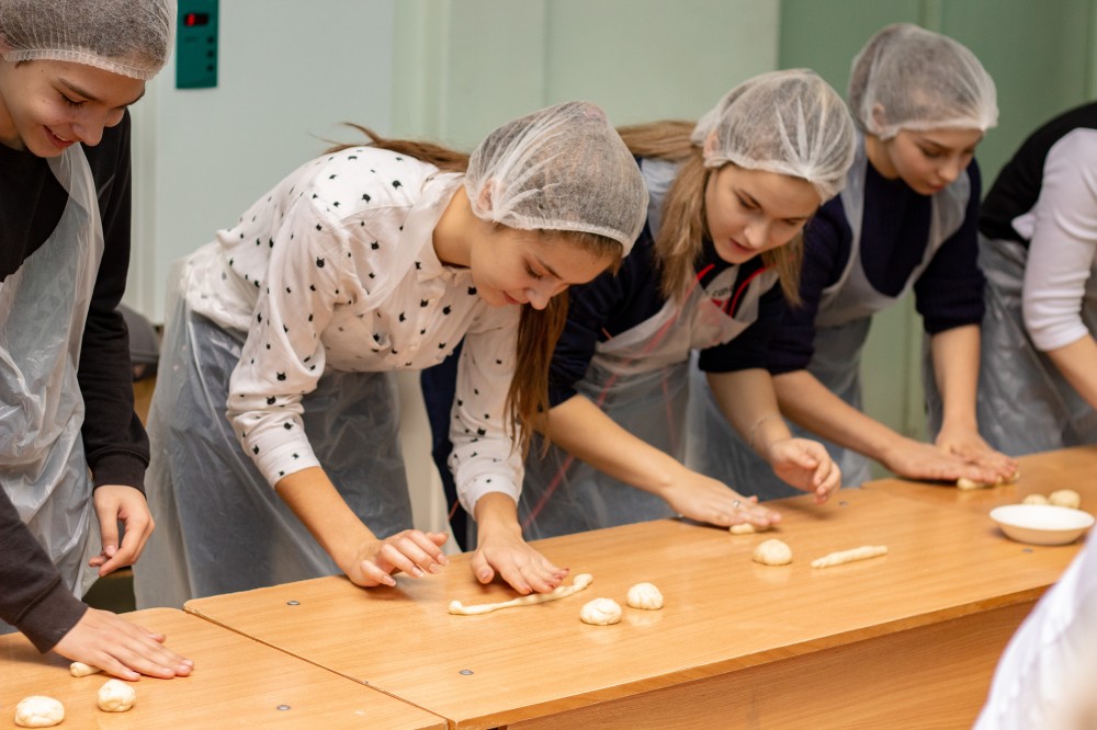 Далее дети под руководством доцента кафедры Хмелёвой Е.В и студентов направления Продукты питания из растительного сырья освоили базовые кулинарные навыки по раскатыванию теста, формованию и выпечке мелкоштучных сдобных изделий.