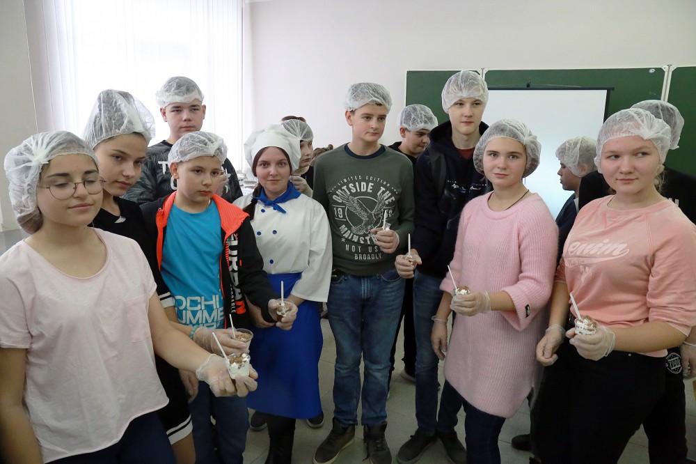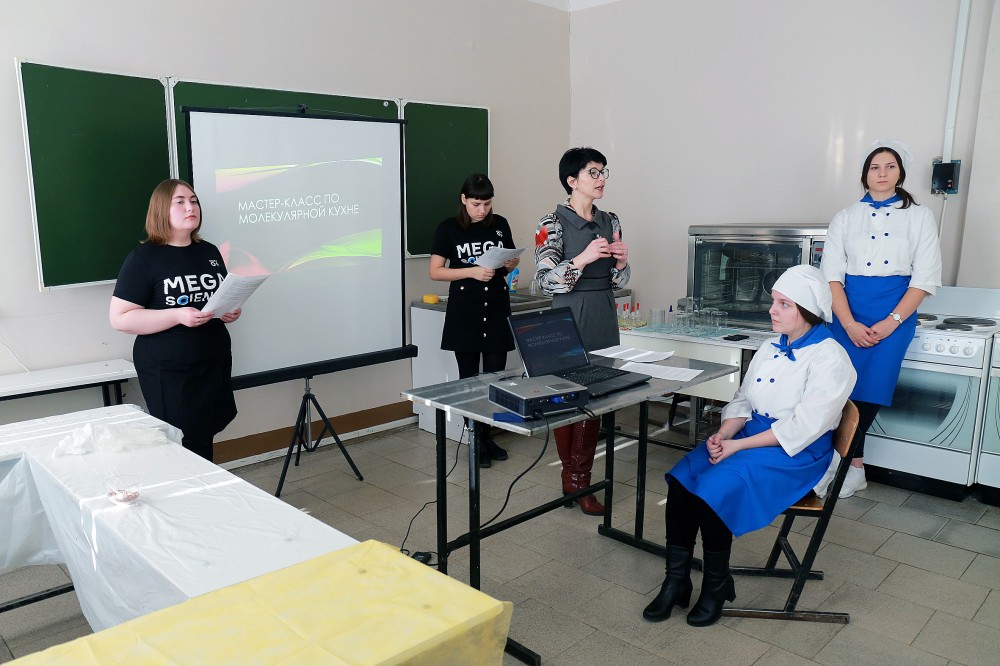 Кулинарный мастер-класс по молекулярной кухне предназначался для школьников 7-8 классов. В программе мастер-класса было знакомство со способами и методами, используемыми в молекулярной кухне, в практической части приготовление блюд (молекулярный шоколадный мусс, апельсиновые спагетти) и дегустация собственноручно приготовленных «шедевров» молекулярной кухни.