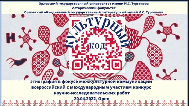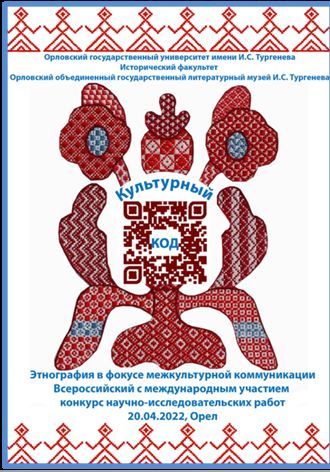 Елена Череповская, ученица 11 класса технологического профиля, разработала дизайн рекламно-информационной кампании конкурса на основе синтеза традиционных и современных образов. В центре композиции она поместила куар-код, всем известный и узнаваемый в связи с эпидемией коронавируса. Так как конкурс посвящен этнографической проблематике, то его название стало центральный элементом узнаваемого регионального этнокультурного бренда – орловского списа – древней и загадочной вышивки счетной гладью. Выбрав для оформления традиционные для этой вышивки красный и синий цвета, Елена создала лаконичную, цельную, яркую и запоминающуюся эмблему конкурса.