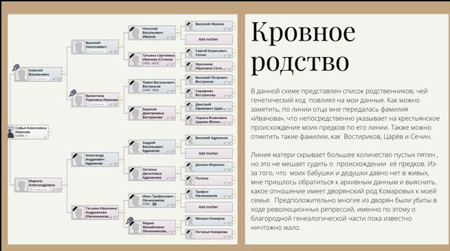 Софья Иванова проследила историю шести поколений своей семьи. Она искала информацию не только у дальних и близких родственников, но и в семейных и государственных архивах. Результатом ее исследования стало генеалогическое древо из 60 (!) имен, вершиной которого являются сама Софья, ее братья и сестра, а корни уходят в дореволюционную России к крестьянским и дворянским семьям Ивановых, Востриковых, Царевых, Комаровых.