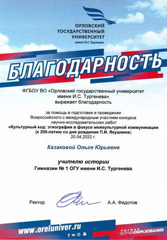 В результате в номинации «Мои корни» молодежного конкурса научно-исследовательский проект Софьи Ивановой признан лучшим, автор награжден дипломом, а научный руководитель, учитель истории гимназии, О.Ю. Казакова, - благодарственным письмом от организаторов.