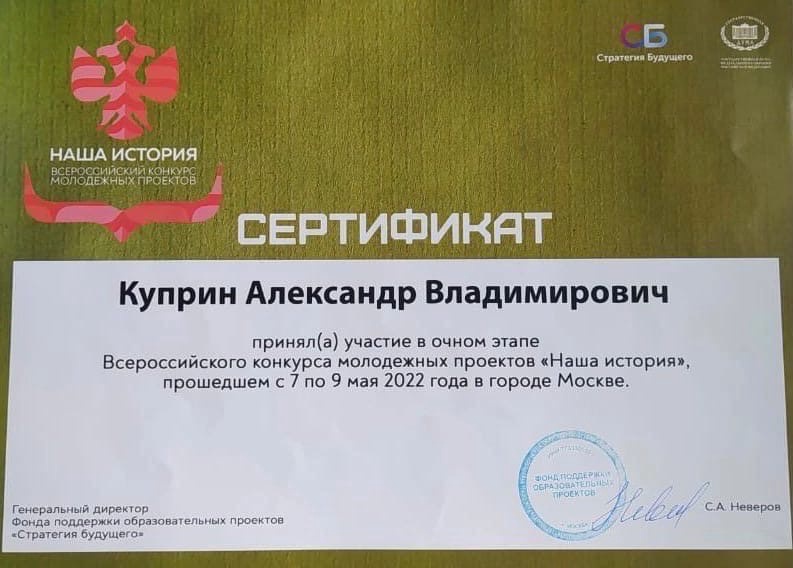 Одновременно в Москве организован Всероссийский конкурс молодежных проектов «Наша история». В форматах рисунков, видеороликов, эссе, поэтических произведений и исследовательских работ конкурсанты представили свои мысли на тему победы русской армии в Отечественной войне 1812 года. В заочном этапе приняло участие около 6 тыс. человек. В финал вышло 600 человек в возрасте от 7 до 35 лет из всех регионов страны, в том числе учащийся 10 класса 10 класса социально-правового профиля Александр Куприн. Очный этап защиты проектов перед экспертной комиссией прошел в Москве с 7 по 9 мая. Он представил поэму в трех частях, написанную от лица участников наполеоновских войн. Вот ее фрагменты: