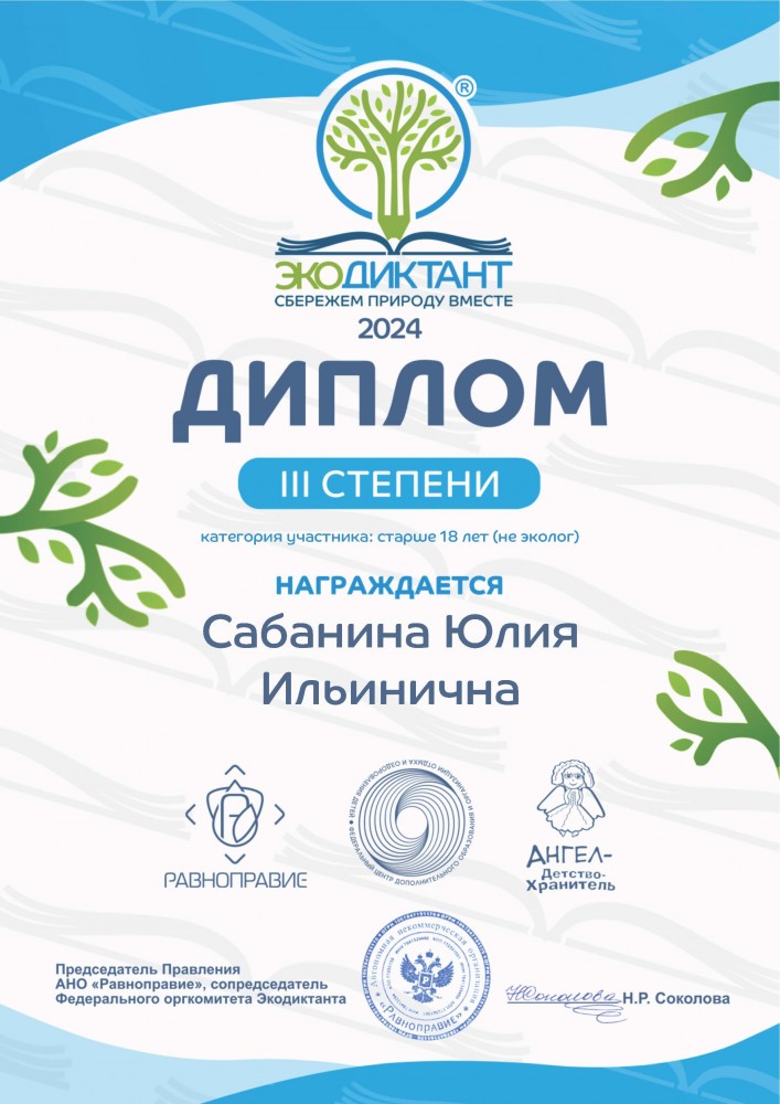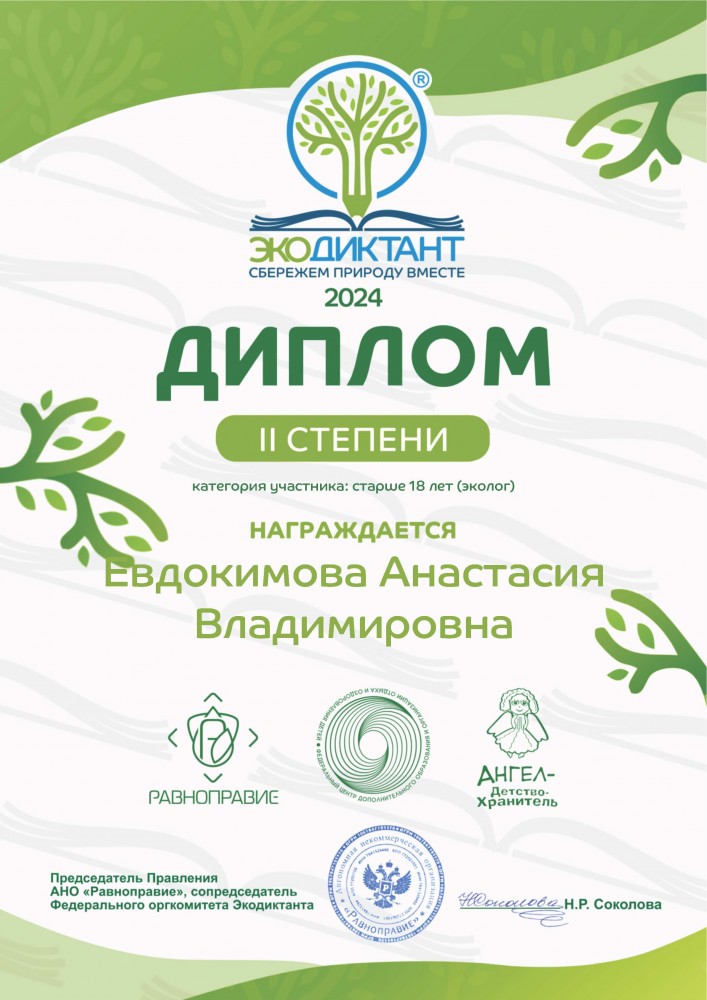 В номинации «НЕ ЭКОЛОГ» Дипломом II степени награждена Дарья Балахонова, студентка группы 41ЭП, Дипломом III степени - Юлия Сабанина, студентка группы 21Бб, направление подготовки 06.03.01 Биология.