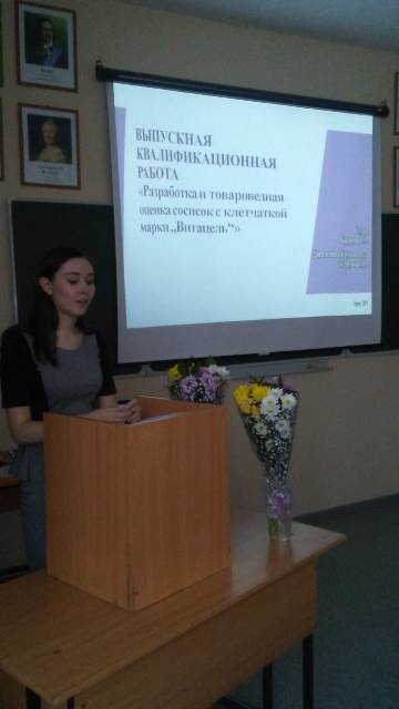 Бердюгина Александра Ростиславовна представила тему «Разработка и товароведная оценка сосисок с клетчаткой марки «Витацель»», которую защитила на «отлично».