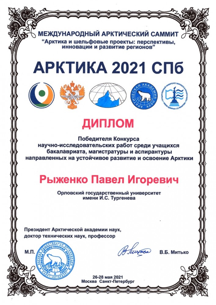 Поздравляем победителя Конкурса научно-исследовательских работ в рамках Международного Арктического саммита аспиранта Рыженко Павла!