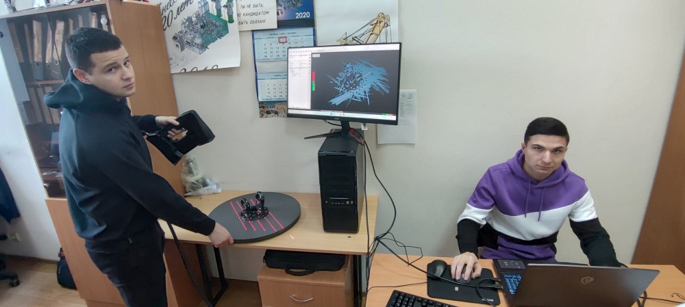 Студенты кафедры подъемно-транспортных, строительных и дорожных машин проходят обучение работе на 3D сканере. С последующей обработкой полученной модели и разработкой чертежей.