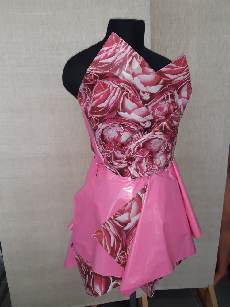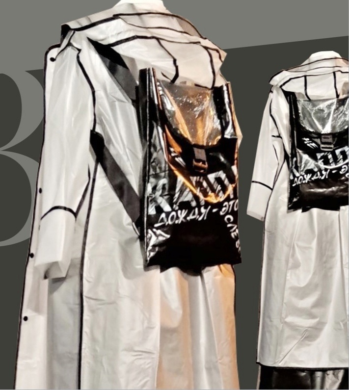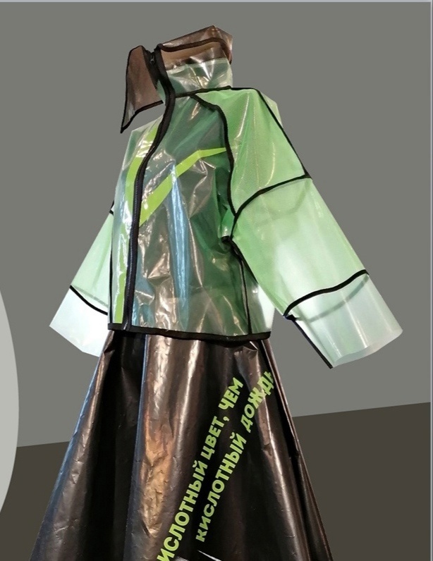 Во второй номинации представлена коллекция плащей-дождевиков из ПВХ плёнки с применением кириллических элементов в качестве декора (ручная роспись на пленке и репсовых лентах), а также модель женского платья нестандартного кроя из нетрадиционных материалов. Предметы из трикотажа также представлены в переработке.