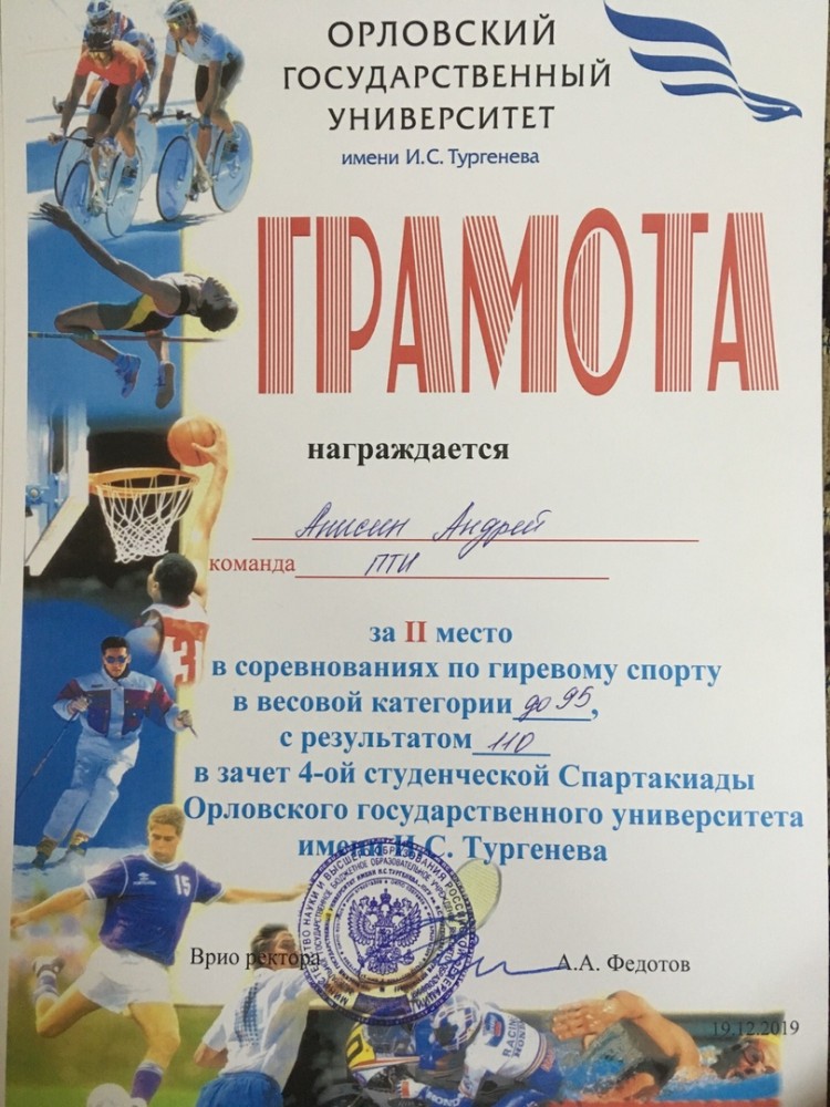 Поздравляем Андрея Анимина, занявшего 2 место в соревнованиях по гиревому спорту в весовой категории до 95, с результатом 110 в зачет 4-ой студенческой Спартакиады Орловского государственного университета имени И.С. Тургенева
