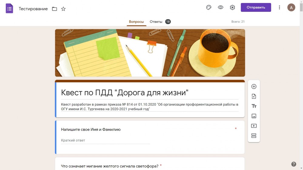 26 ноября 2020г. в Политехническом института имени Н.Н. Поликарпова на факультете среднего профессионального образования был проведен дистанционно КВЕСТ по ПДД «Дорога для жизни».