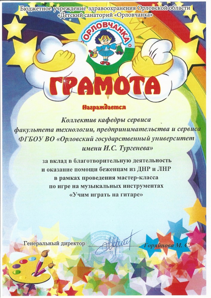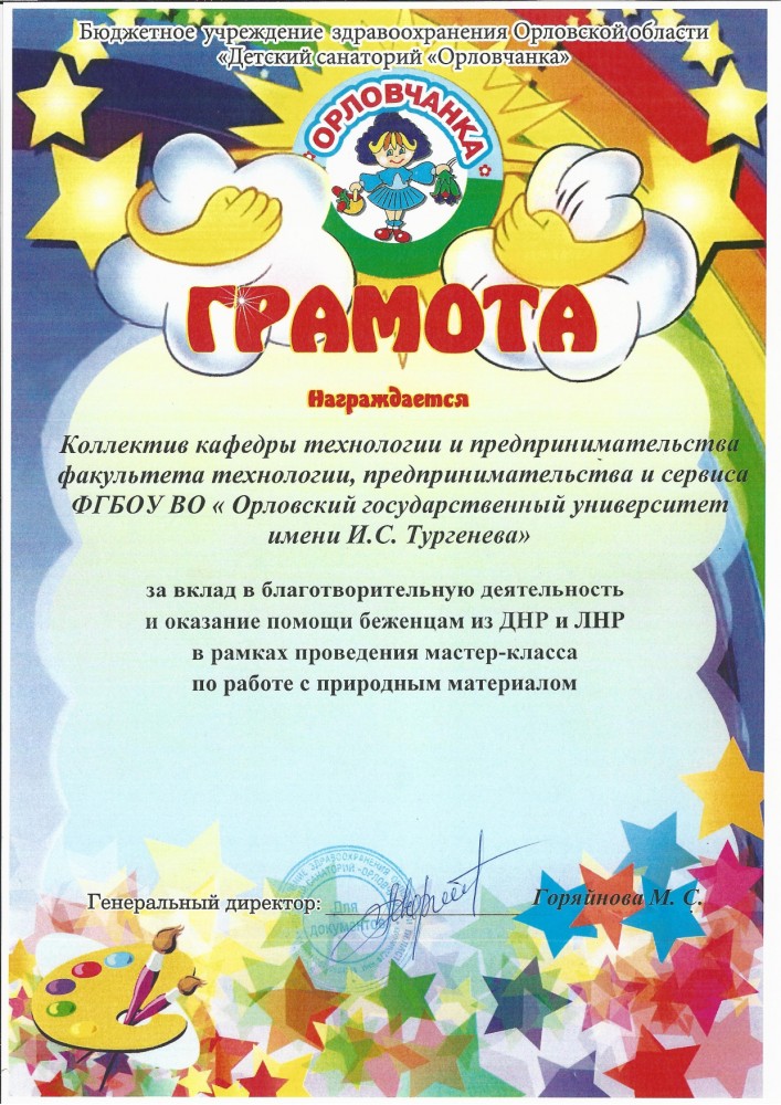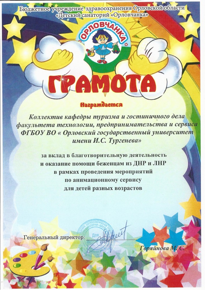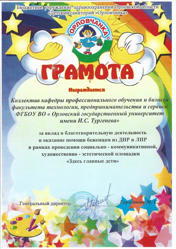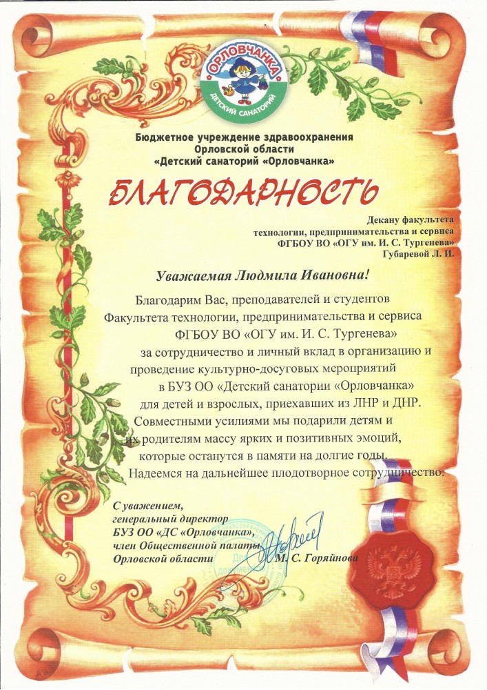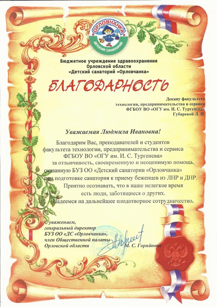 Факультет технологии, предпринимательства и сервиса получил от администрация детского санатория "Орловчанка» благодарности за неоценимую помощь в организации приёма беженцев из ДНР и ЛНР.