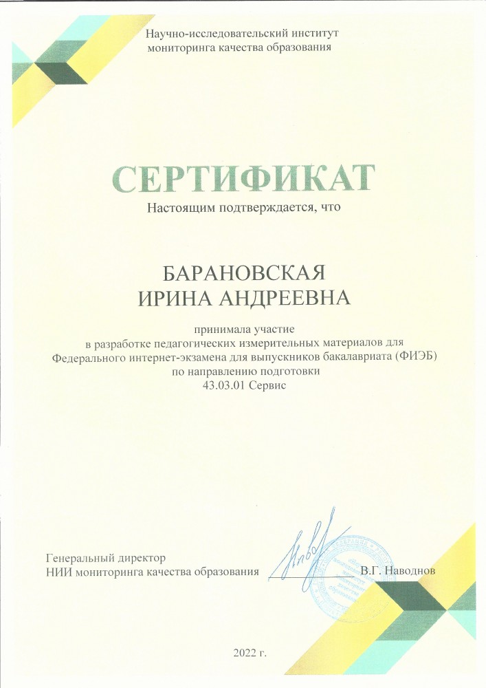 В 2021-2022 учебном году коллектив кафедры сервиса продолжил плодотворное сотрудничество с НИИ мониторинга качества образования, который в письме на имя ректора ФГБОУ ВО «Орловский государственный университет имени И.С. Тургенева» Александра Анатольевича Федотова выразил искреннюю благодарность за плодотворное сотрудничество при подготовке и проведении Федерального интернет-экзамена для выпускников бакалавриата (ФИЭБ - 2022).