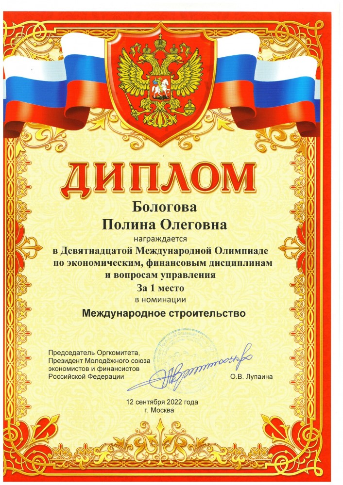 Бологова Полина Олеговна - XIX Международная Олимпиада по экономическим, финансовым дисциплинам и вопросам управления. Номинация 66. Международное строительство