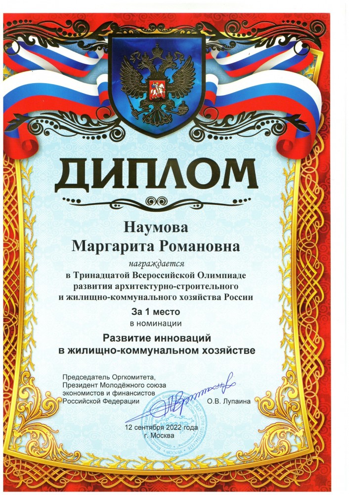 Наумова Маргарита Романовна - XIII Всероссийская Олимпиада развития архитектурно-строительного и жилищно-коммунального хозяйства России. Номинация 26. Развитие инноваций в жилищно-коммунальном хозяйстве.