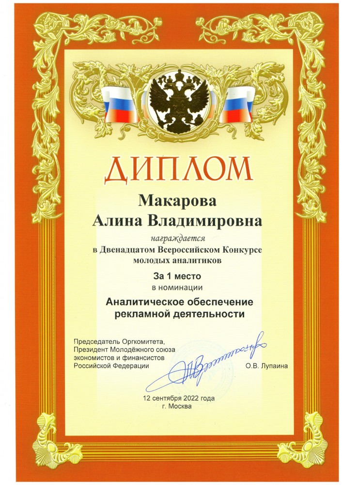 Макарова Алина Владимировна - XII Всероссийский Конкурс молодых аналитиков. Номинация 90. Аналитическое обеспечение рекламной деятельности.
