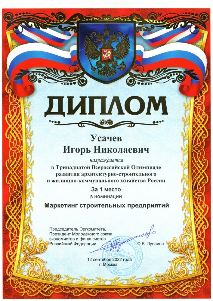 Усачев Игорь Николаевич - XIII Всероссийская Олимпиада развития архитектурно-строительного и жилищно-коммунального хозяйства России. Номинация 83. Маркетинг строительных предприятий.