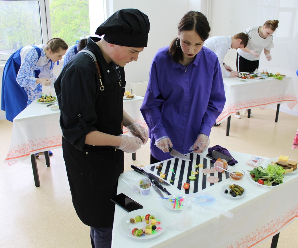 Третий этап - конкурс «Мамины рецепты» (практико-ориентированное задание). Командное выполнение практико-ориентированного задания направлено на оценку уровня теоретической подготовки и освоения практических навыков по профилю профессиональной деятельности. Каждой команде из предложенного набора фруктов необходимо было приготовить и оформить канапе, соответствующее тематике конкурса.