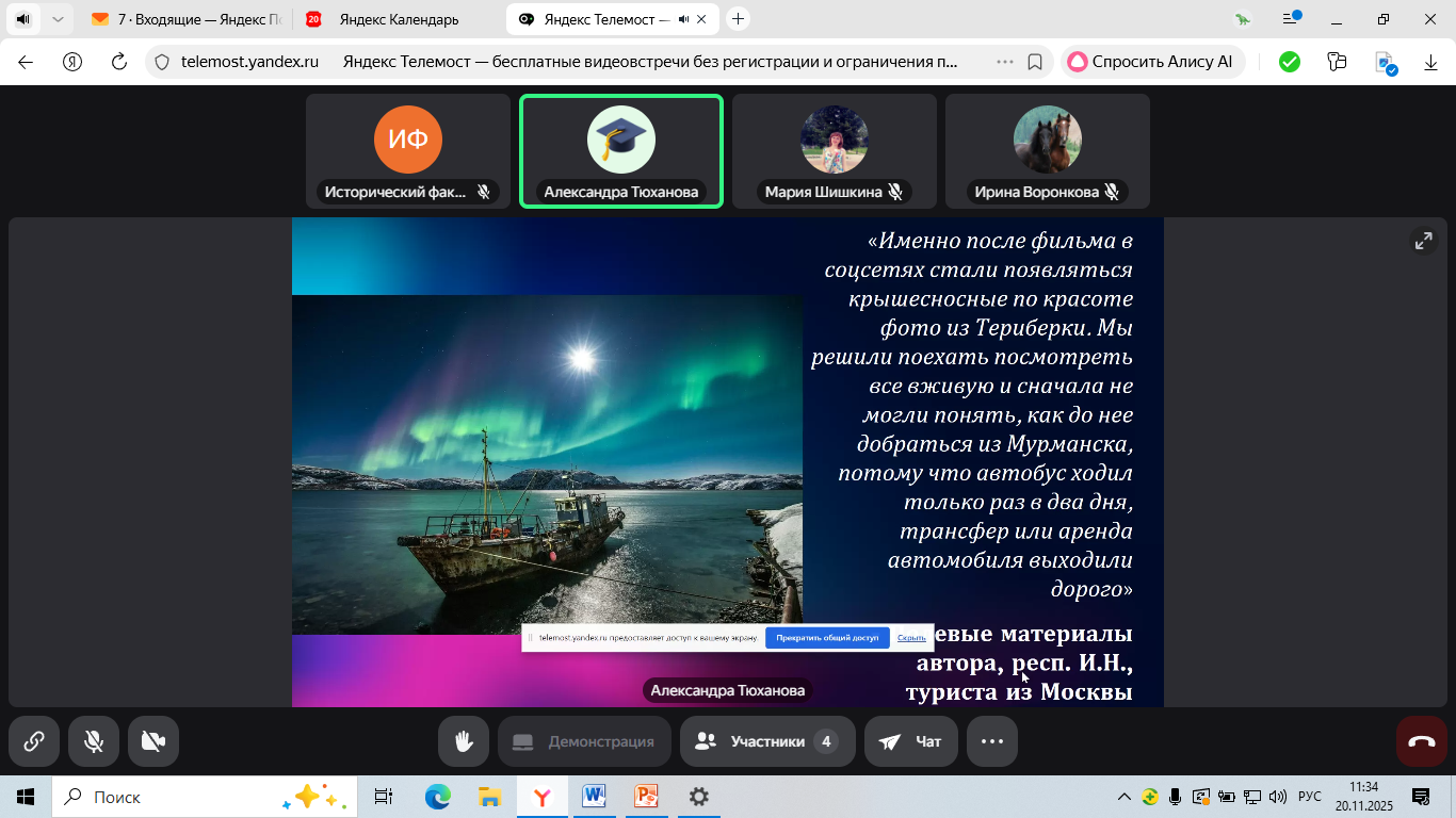 О трансформации жизни малого города/села Териберки Мурманской области в контексте изменений в нем после съемок фильма «Левиафан» поведала Тюханова Александра, аспирант Института этнологии и антропологии им. Н.Н. Миклухо-Маклая Российской академии наук, г.Москва;
