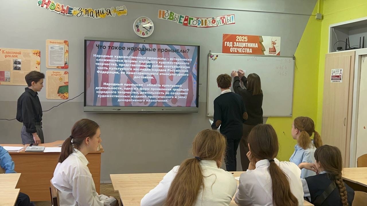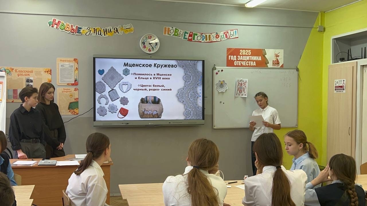 Школьникам рассказали, что такое "народный промысел" и какие промыслы есть в нашем крае. Ученики познакомились с историей Орловского списа, Мценского кружева, Ливенской гармошки, Чернышинской и Плешковской игрушек.