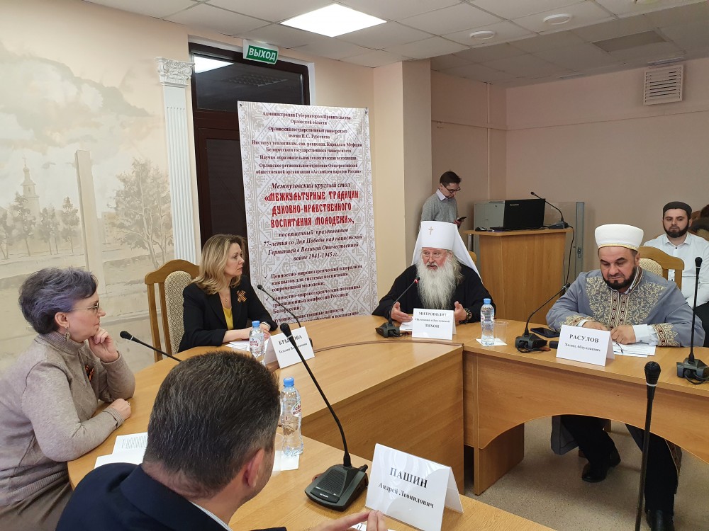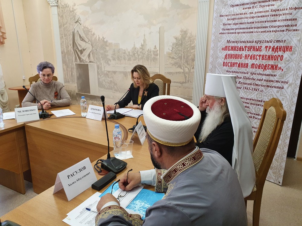 В преддверии празднования 77-летия Победы Красной Армии в Великой Отечественной войне в Орловском государственном университете имени И.С. Тургенева под эгидой Администрации Губернатора и Правительства Орловской области прошел межвузовский круглый стол «Межкультурные традиции духовно-нравственного воспитания молодежи». В организации круглого стола приняли участие Институт теологии имени свв. равноапостольных Кирилла и Мефодия Белорусского государственного университета, Научно-образовательная теологическая ассоциация и Орловское региональное отделение Общероссийской общественной организации «Ассамблея народов России».