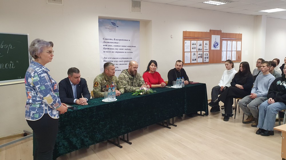 12 декабря 2024 г. на кафедре теологии, религиоведения и культурных аспектов национальной безопасности ОГУ имени И.С. Тургенева состоялось внеочередное заседание студенческого дискуссионного клуба «Диалог мировоззрений». В этот раз тему встречи – «Разговор за “лентой”» - определили гости: командир роты стрелкового батальона «Скиф» казачьей бригады «Терек» с позывным «Борода», медик штурмового отряда с позывным «Стриж», а также Юлия Айданова, магистрант-конфликтолог, организатор добровольческого отряда «Сила V правде». Пообщаться с участниками СВО пришли будущие теологи, юристы, конфликтологи, а также директор юридического института Васюков С.В., зав. кафедрой теологии, религиоведения и культурных аспектов национальной безопасности Человенко Т.Г., преподаватели кафедры Ашихмина Е.Н., Королев Ю.А., иерей Торопов А., специалист по УМР кафедры социального управления и конфликтологии Апалькова Л.Н.