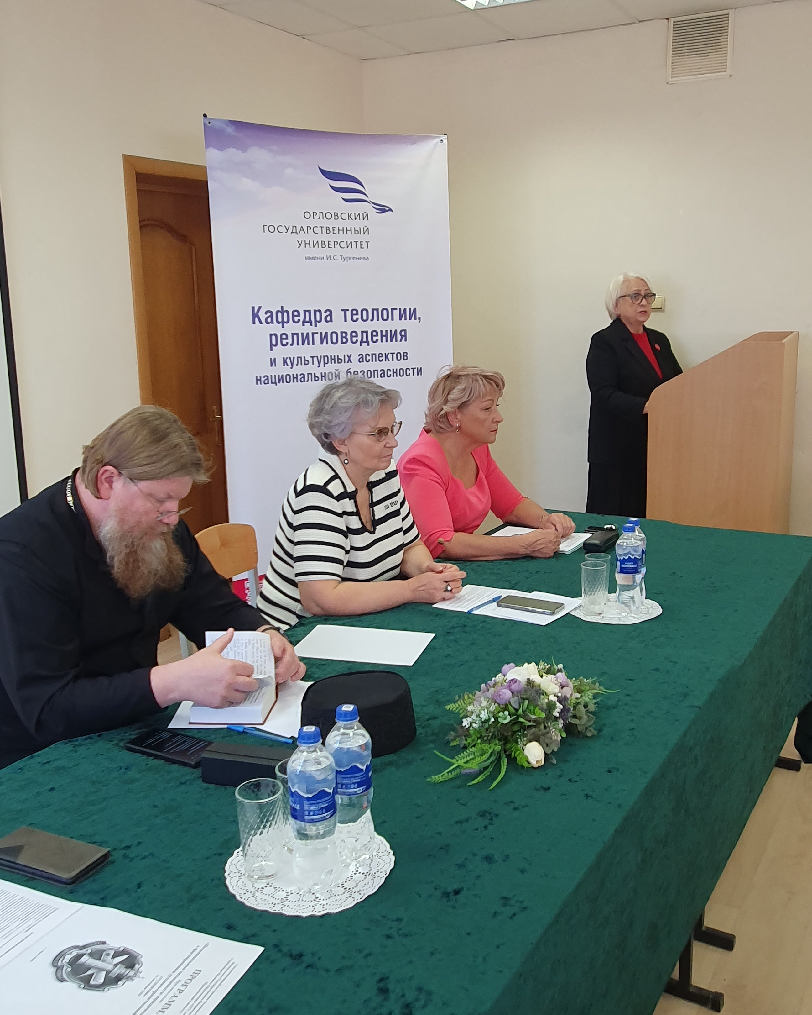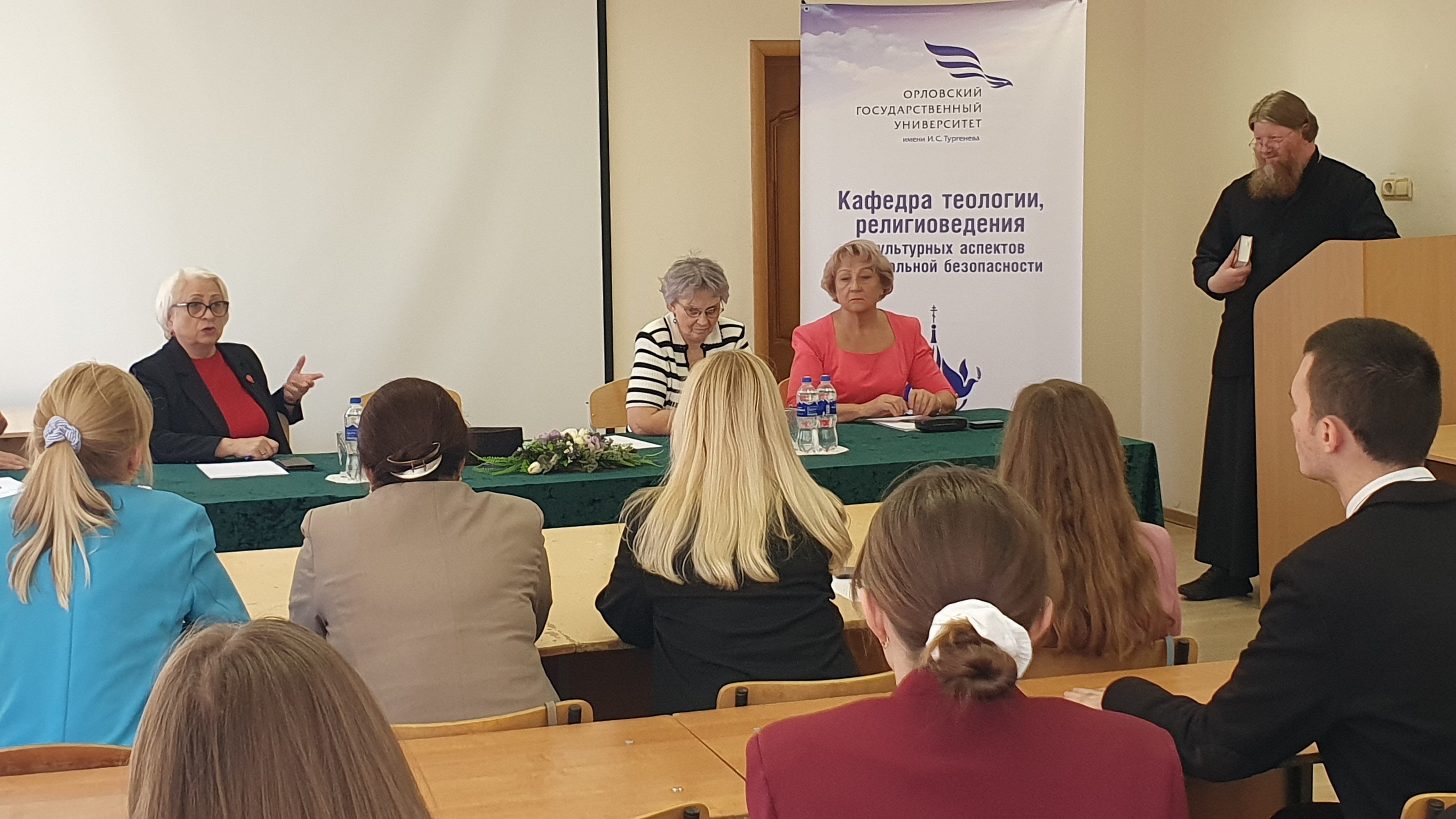 Балашова Н.П., уполномоченный по правам человека в Орловской области, на примере конкретных ситуаций показала опасность формально-законнического подхода к решению проблем людей, попавших в трудную жизненную ситуацию, подчеркнув необходимость наличия у юриста не только профессиональных знаний, но и четкой нравственной позиции. Протоиерей Николай Евдокимов, духовник Орловской православной гимназии во имя свмч. Иоанна Кукши, магистрант кафедры теологии, религиоведения и культурных аспектов национальной безопасности, в своем выступлении остановился на важности евангельских заповедей в жизни современного человека. Приведенные им библейские примеры подчеркнули вневременной характер религиозных нравственных норм и их созвучие с государственным законодательством. Человенко Т.Г., зав. кафедрой теологии, религиоведения и культурных аспектов национальной безопасности, сосредоточила внимание студентов на культурно-цивилизационных и духовно-нравственных аспектах религиозного размежевания Запада и Востока, что привело, в том числе, к различному понимаю права и его роли в жизни человека, а также на роли Указа Президента РФ 809 от 9 ноября 2022 г. «Об утверждении Основ государственной политики по сохранению и укреплению традиционных российских духовно-нравственных ценностей», направленного на актуализацию нравственного идеала России, характеризующего её как уникальное государство-цивилизацию. Петрунин В.В., доцент кафедры теологии, религиоведения и культурных аспектов национальной безопасности, остановился на правовой проблематике социальной доктрины РПЦ, показав взаимосвязь духовно-нравственного состояния человека и общества и правовой системы государства.