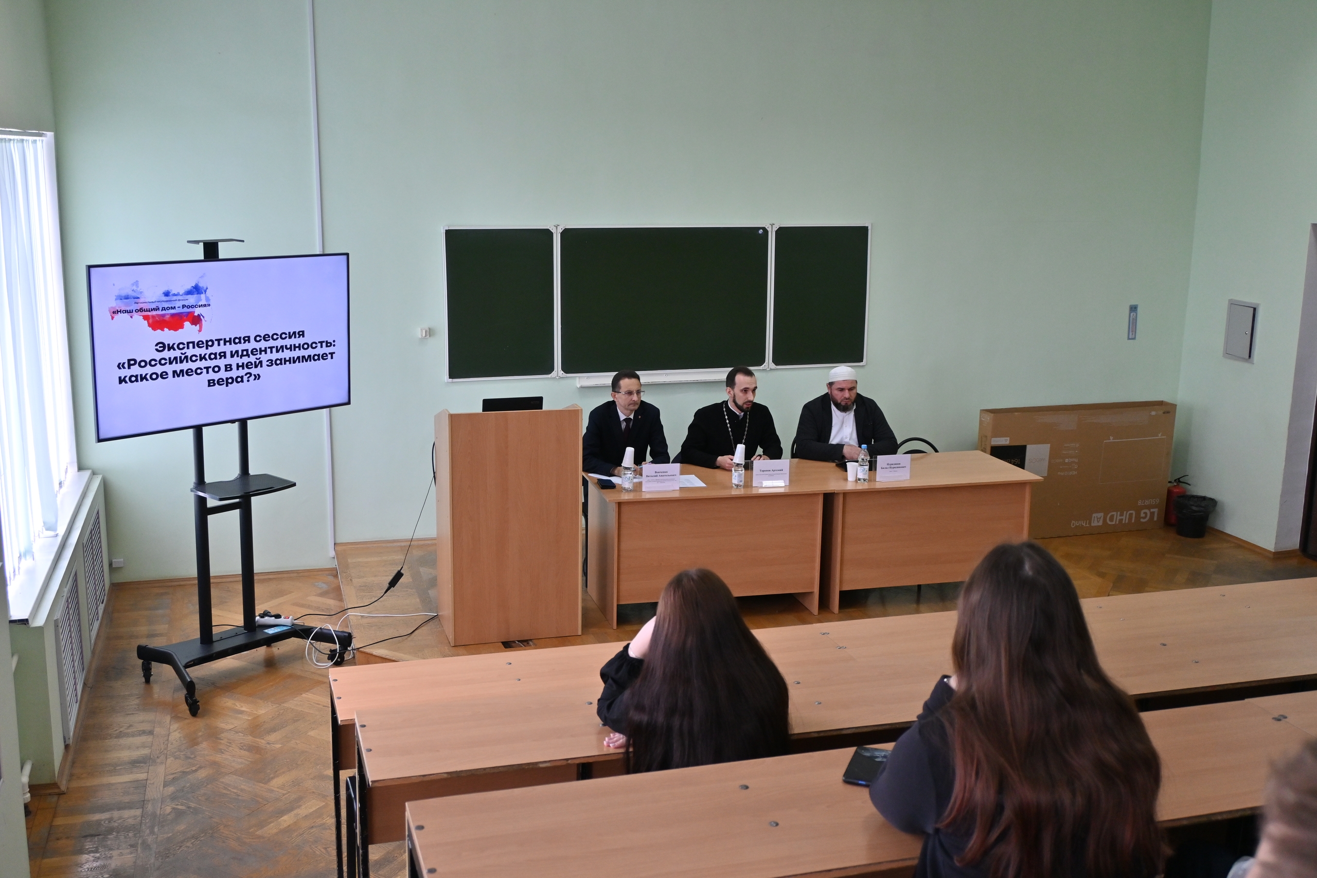 Сессию «Российская идентичность: какое место в ней занимает вера?» модерировал доцент кафедры теологии, религиоведения и культурных аспектов национальной безопасности Вовченко В.А., который рассказал присутствовавшим об особенностях религиозной идентичности современного российского общества, о динамике уровня и характера религиозности за первую четверть ХХI века, в свете проведенных в 2024 и 2025 годах социологических опросов ВЦИОМ и ФОМ. На сессии также выступили иерей Артемий Торопов, ассистент кафедры теологии, религиоведения и культурных аспектов национальной безопасности, руководитель епархиального отдела религиозного образования и катехизации, и имам г. Мценска Нуридинов Билал Нуридинович.