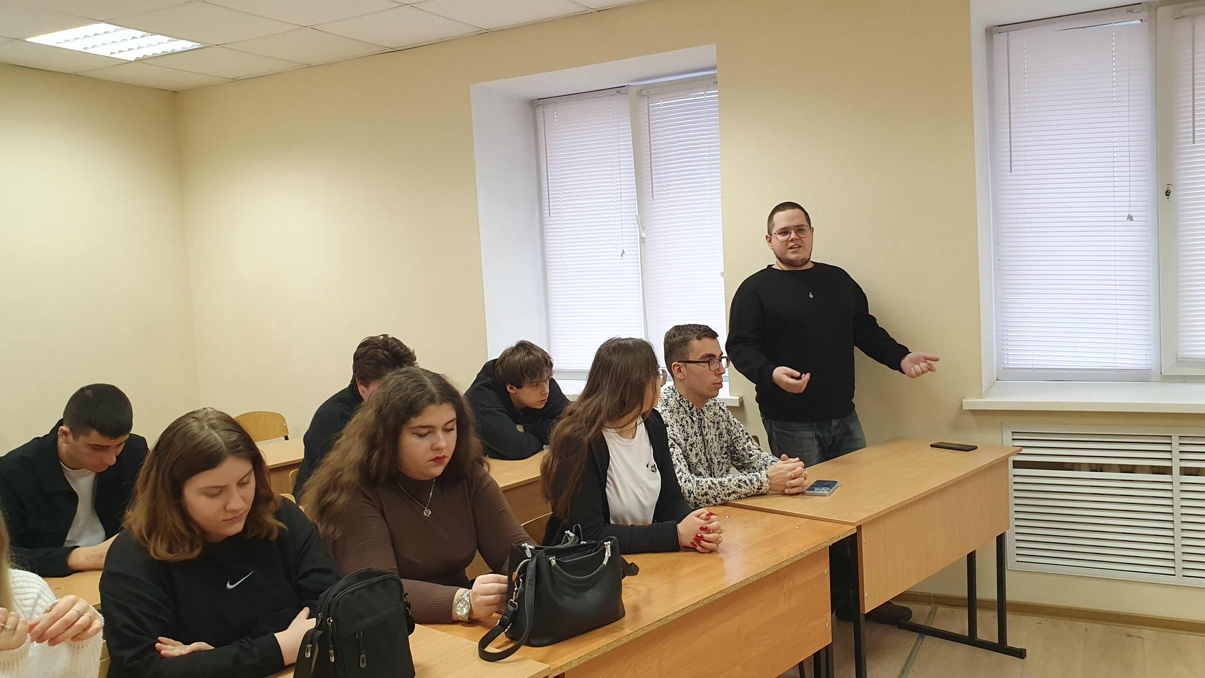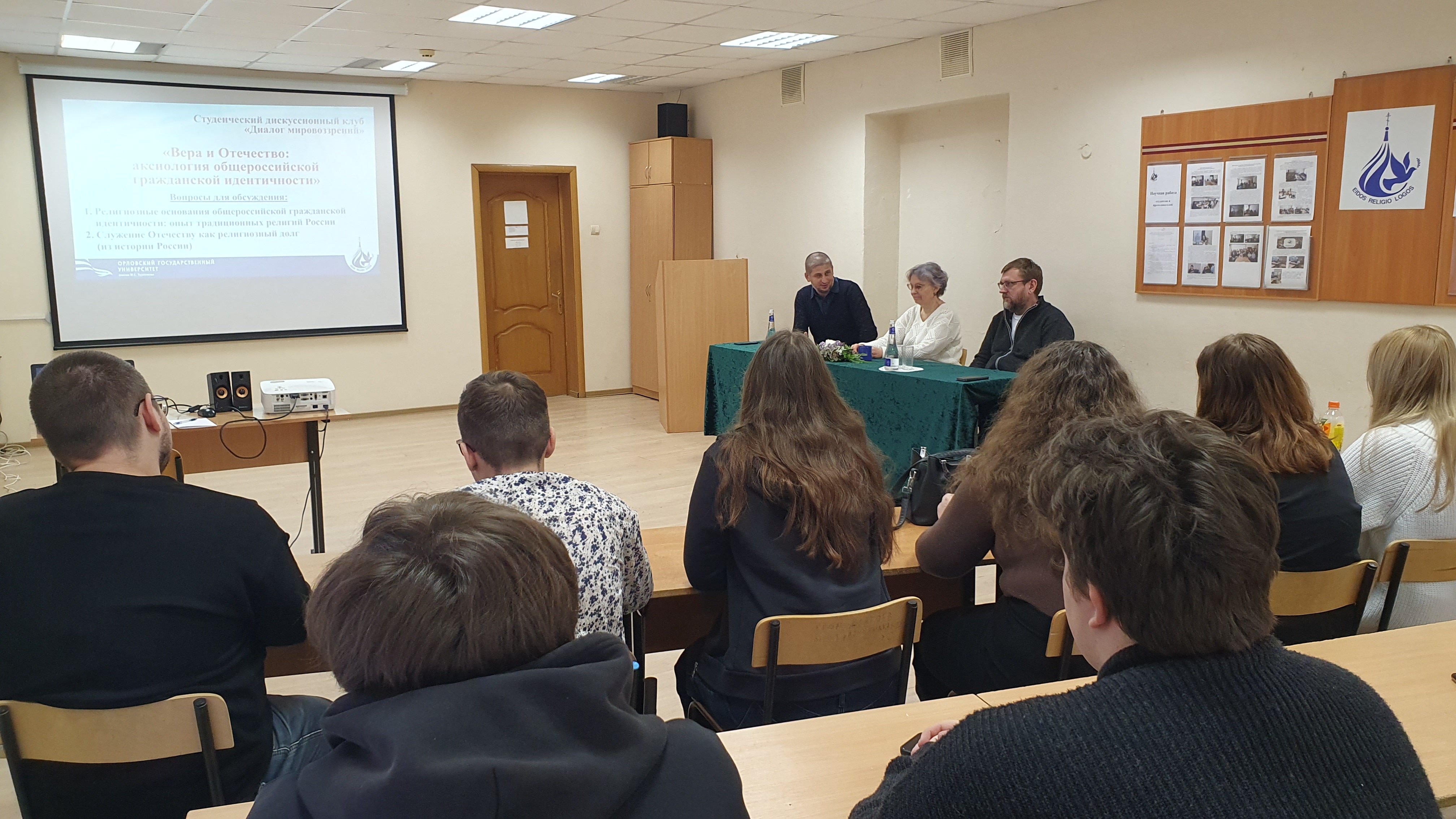 19 декабря 2025 г. на кафедре теологии, религиоведения и культурных аспектов национальной безопасности юридического института ОГУ имени И.С. Тургенева состоялось очередное заседание студенческого дискуссионного клуба «Диалог мировоззрений» на тему «Вера и Отечество: аксиология общероссийской гражданской идентичности». Дискуссия носила знаковый характер: она стала не только символическим итогом цикла мероприятий Года защитника Отечества и 80-летия Победы в Великой Отечественной войне, но и началом работы кафедры в рамках Года единства народов России.