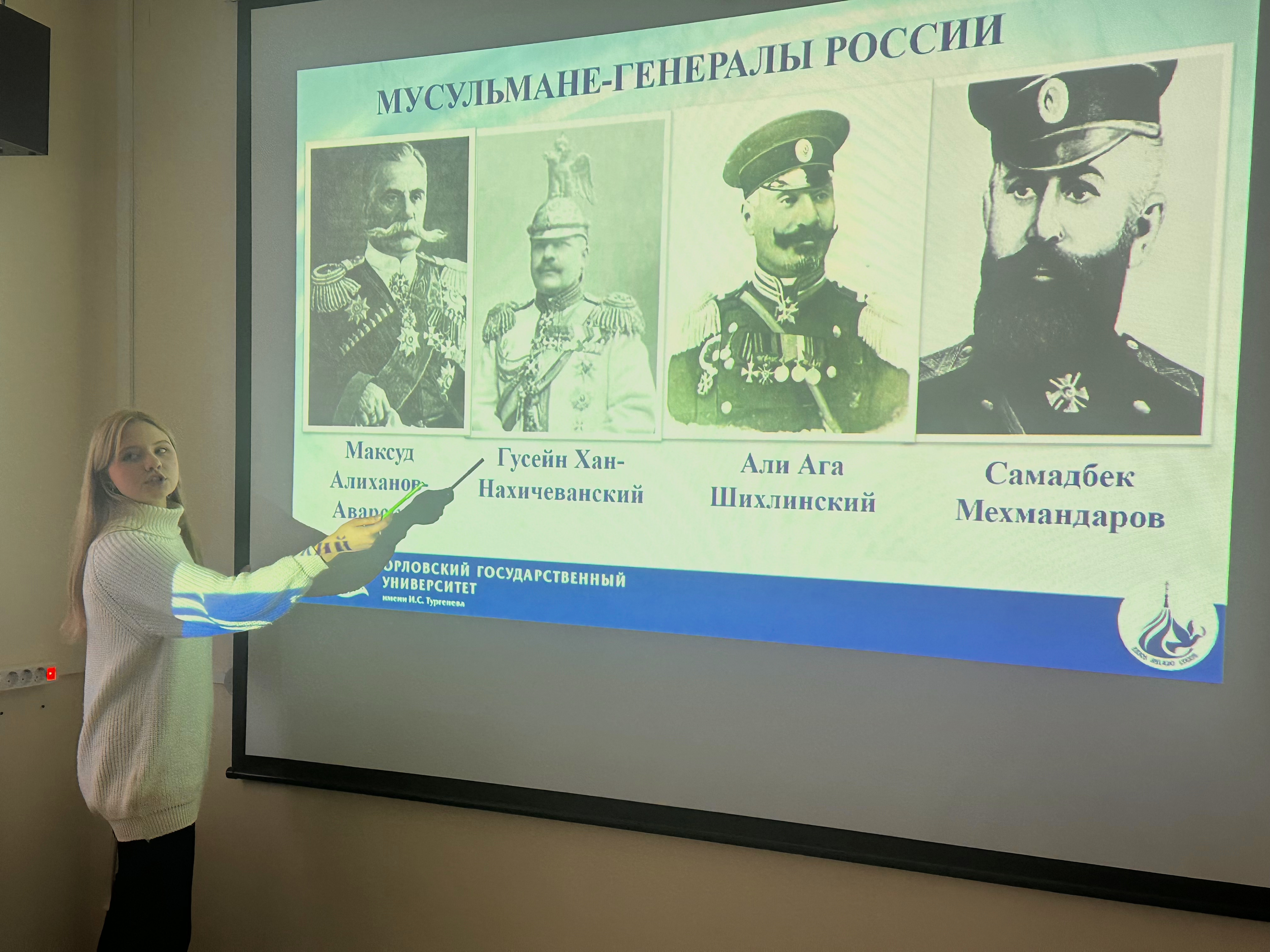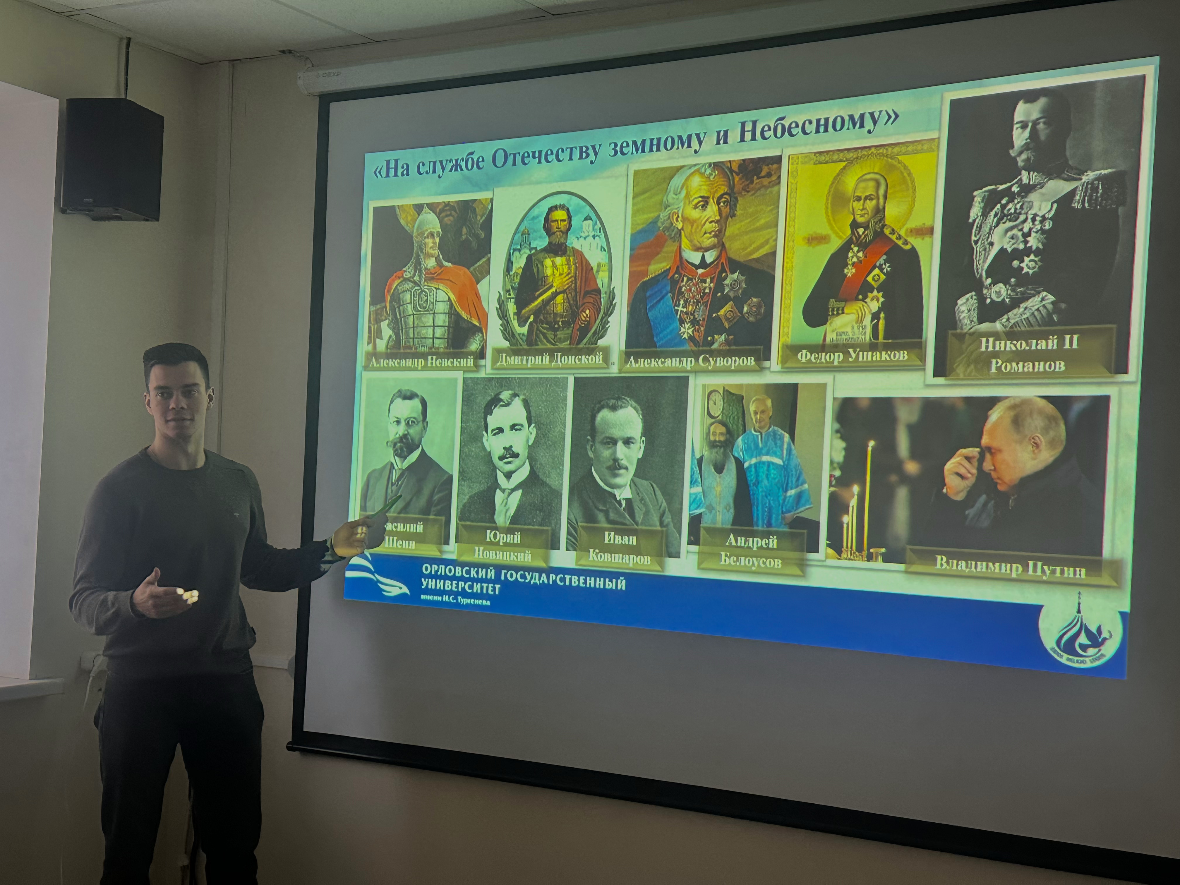 Аргументируя данную точку зрения, студент бакалавриата Левичев И. обратился к тем историческим деятелям и полководцам, чья православная вера стала хрестоматийным примером служения земному и Небесному Отечеству: св. благоверным князьям Александру Невскому и Дмитрию Донскому, полководцам Александру Суворову и св. Федору Ушакову, государю-императору, страстотерпцу Николаю II Романову, действительному статскому советнику, депутату Государственной думы Российской империи IV созыва, сщмч. Василию Шеину, св. юристам Юрию Новицкому и Иоанну Ковшарову и др. К подвигам мусульман-военачальников обратилась студентка бакалавриата Сухоносова А., рассказав о доблестном служении России генералов М. Алиханова-Аварского, Г. Хан-Нахичеванского, А.А. Шихлинского, С. Мехмандарова и др. Как показал Власов А., магистрант II курса обучения, мусульмане России отстаивали интересы нашей страны в разные исторические эпохи (от Ливонской войны до наших дней), считая для себя почетной смерть «воина, отдавшего жизнь в войне за Государя» («Социальная доктрина российских мусульман»). Защита Отечества как духовно-нравственный долг мусульманина была проиллюстрирована видеоматериалом об участии в Первой мировой войне Кавказской туземной конной дивизии («Дикой дивизии»), о которой подробнее рассказал студент бакалавриата Игнатов П. Не забыли отметить и примеры современных нам политических деятелей, православных и мусульман, для которых служение Отечеству и людям органично сочетается с их религиозным мировоззрением.