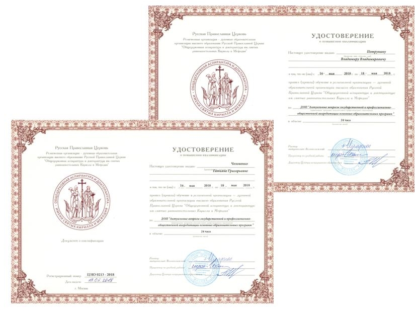 По итогам работы семинара зав. кафедрой религиоведения и теологии Т.Г. Человенко и доцент кафедры религиоведения и теологии В.В. Петрунин получили удостоверения о повышении квалификации по дополнительной образовательной программе «Актуальные вопросы государственной и профессионально-общественной аккредитации основных образовательных программ».