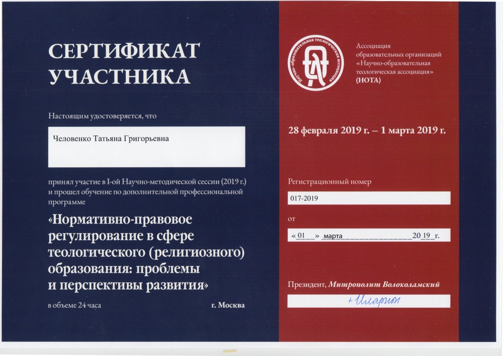 По итогам семинара и работы аттестационной комиссии Т.Г. Человенко был вручен сертификат участника I Научно-методической сессии, как успешно прошедшей обучение по дополнительной профессиональной программе «Нормативно-правовое регулирование в сфере теологического (религиозного) образования: проблемы и перспективы развития». Т.Г. Человенко вошла в состав экспертов НОТА.