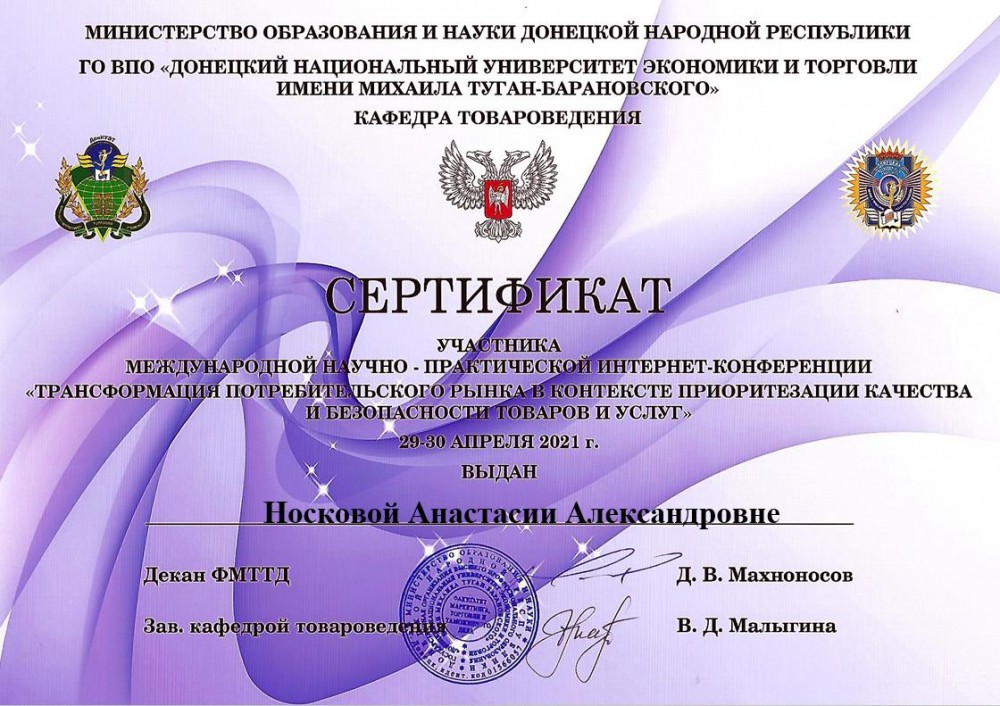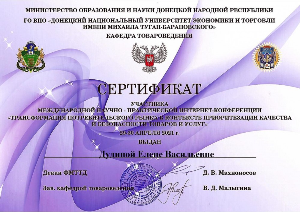 Международная научно-практическая интернет-конференция «Трансформация потребительского рынка в контексте приоритезации качества и безопасности товаров и услуг», 29-30 апреля 2021 года, г. Донецк
