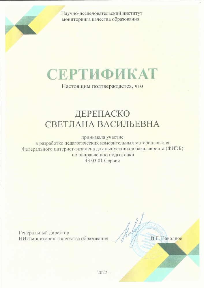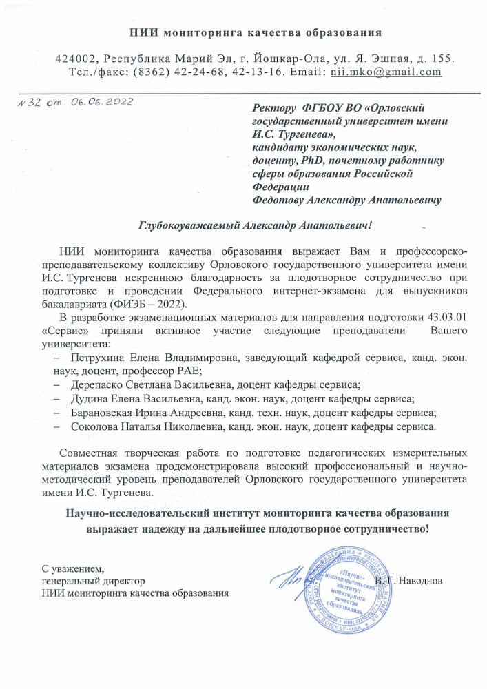 В 2021-2022 учебном году коллектив кафедры сервиса продолжил сотрудничество с НИИ мониторинга качества образования, который в письме на имя ректора ФГБОУ ВО «Орловский государственный университет имени И.С. Тургенева» Александра Анатольевича Федотова выразил искреннюю благодарность за плодотворное сотрудничество при подготовке и проведении Федерального интернет-экзамена для выпускников бакалавриата (ФИЭБ - 2022).