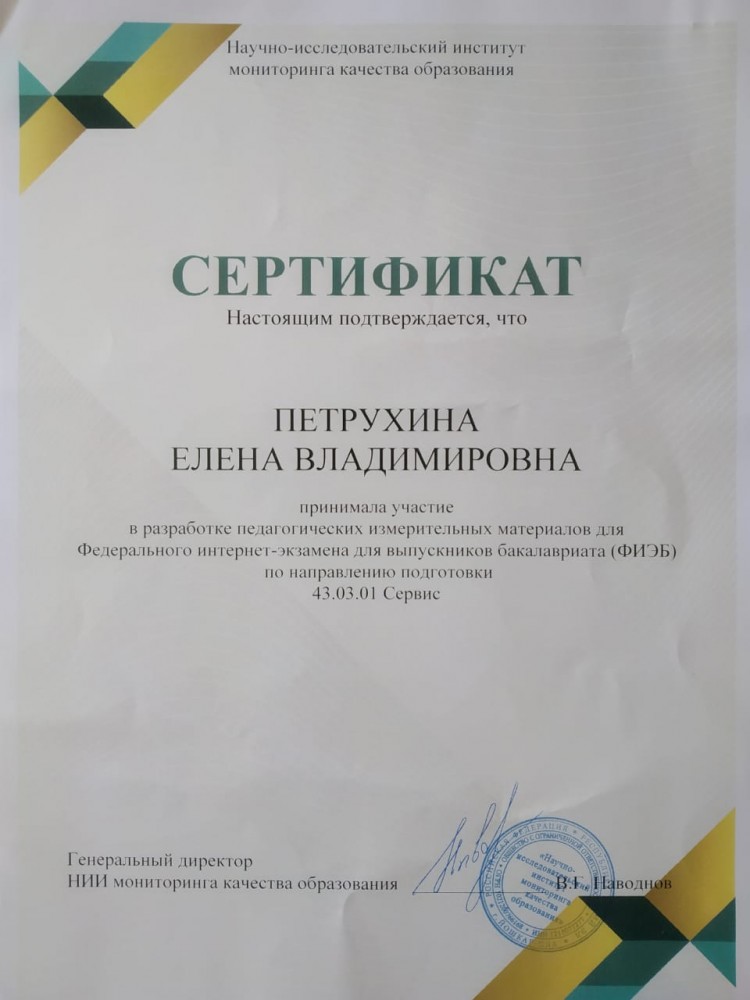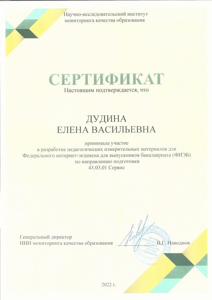 Преподаватели кафедры сервиса принимали участие в создании инновационных педагогических измерительных материалов для федерального проекта по независимой оценке качества образования «Федеральный интернет-экзамен для выпускников бакалавриата (ФИЭБ-2022)» по направлению подготовки 43.03.01 Сервис.