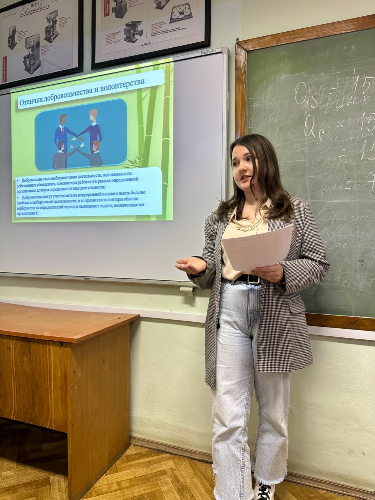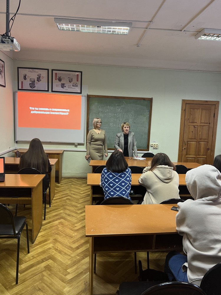 1 декабря 2023 года в 12:00 на базе кафедры сервиса факультета технологии, предпринимательства и сервиса мероприятия проведен ряд мероприятий проекта «Развитие волонтёрства в России». Проект реализован в целях повышения эффективности работы по духовно-нравственному воспитанию молодёжи, формирования активной жизненной позиции и социальной ответственности обучающихся в рамках реализации Федерального проекта «Развитие деятельности добровольческого (волонтёрского) движения» для обучающихся по направлению подготовки 43.03.01 Сервис.